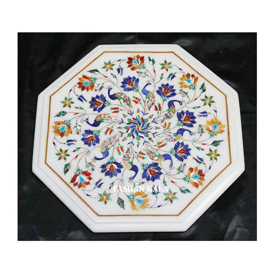 โต๊ะหินอ่อนสีขาวทรงกลมคุณภาพดี ประดับด้วยลายลูกยูงแบบโมเดิร์น ดูหรูหรา