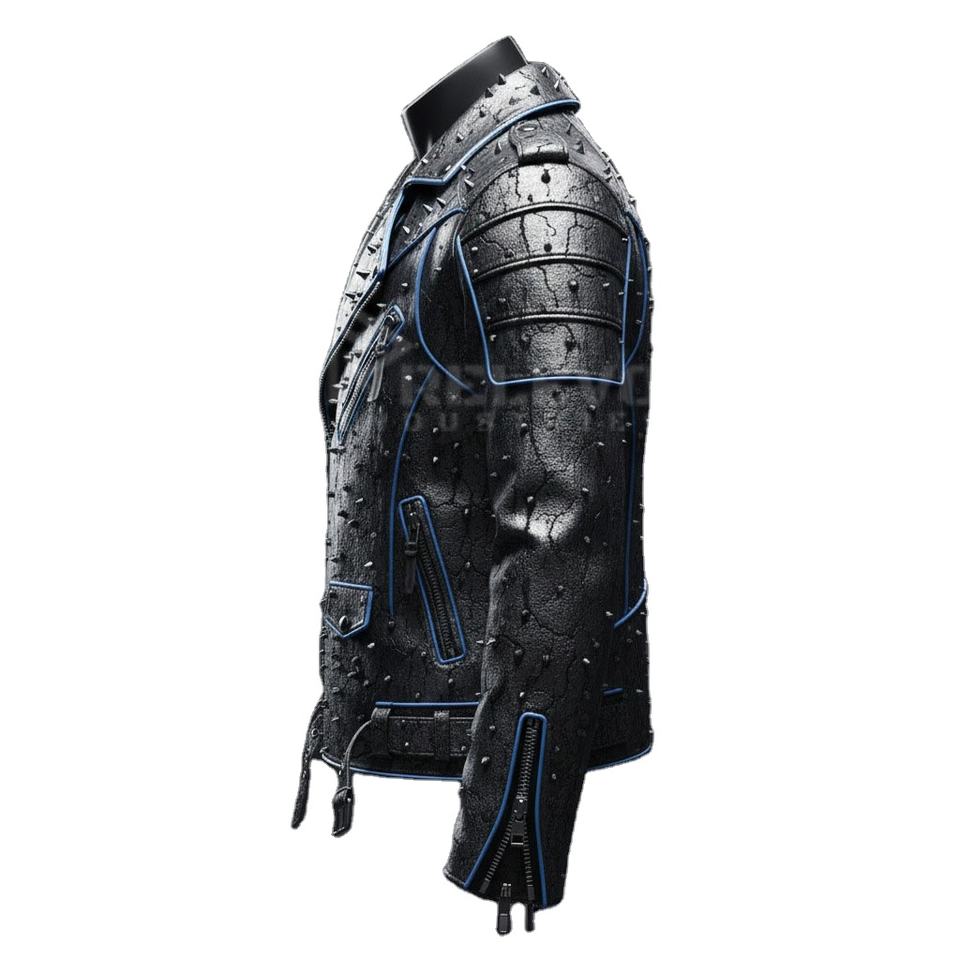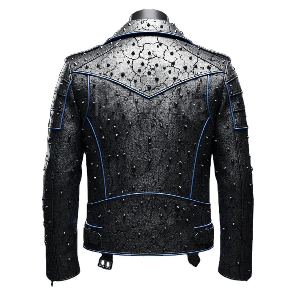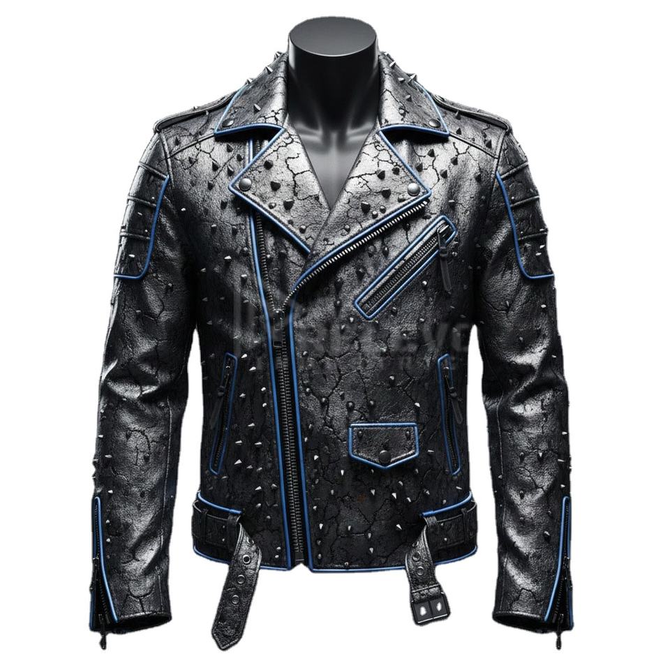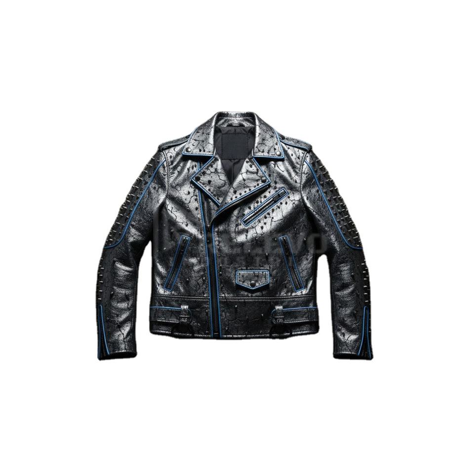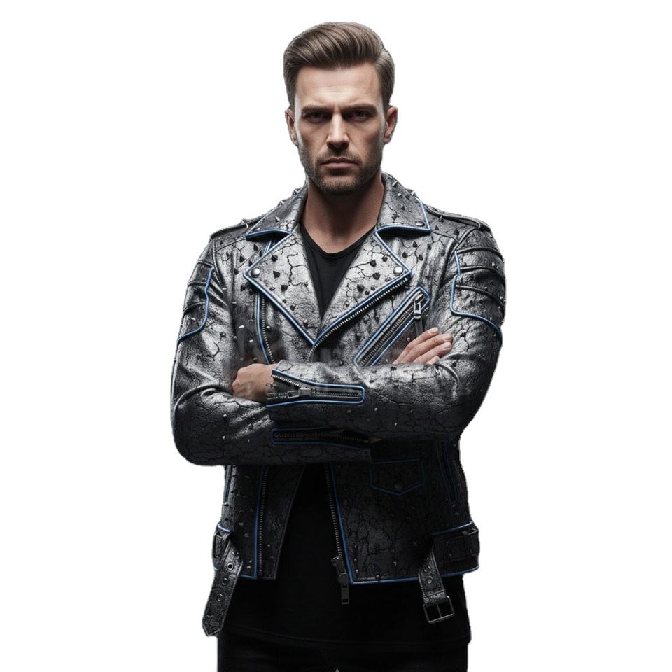 เสื้อแจ็คเก็ตนักขี่มอเตอร์ไซค์หนังสีเทาเมทัลลิกทรงดุดัน ดีไซน์สวยโดดเด่น คอตั้ง แต่งลายพังก์ล้ำยุค ทนทาน พร้อมดีเทลตกแต่งแบบดิสเทรสซิ่ง