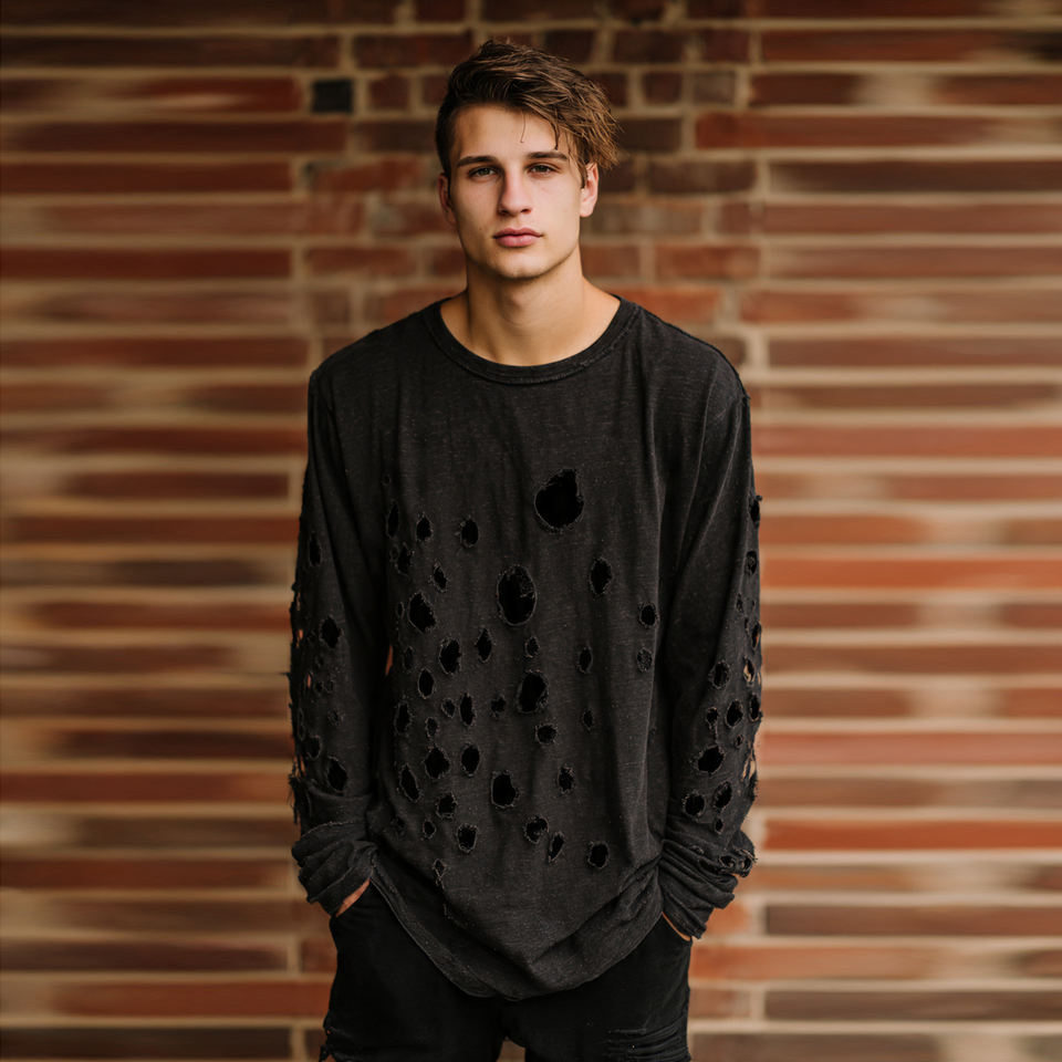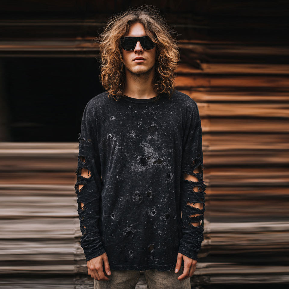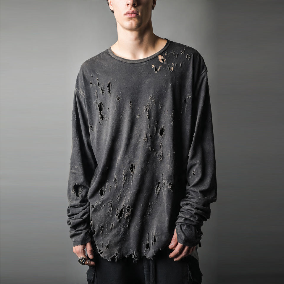 เสื้อยืดแขนยาวทรงหลวมสไตล์ดิสเทรสสำหรับผู้ชาย เสื้อยืดดิสเทรสทรงหลวมไหล่ตกสำหรับฤดูร้อน เสื้อยืดน้ำหนักเบาแห้งเร็วสำหรับผู้ชาย