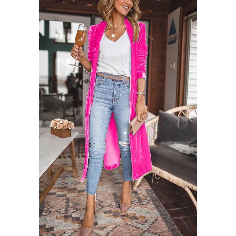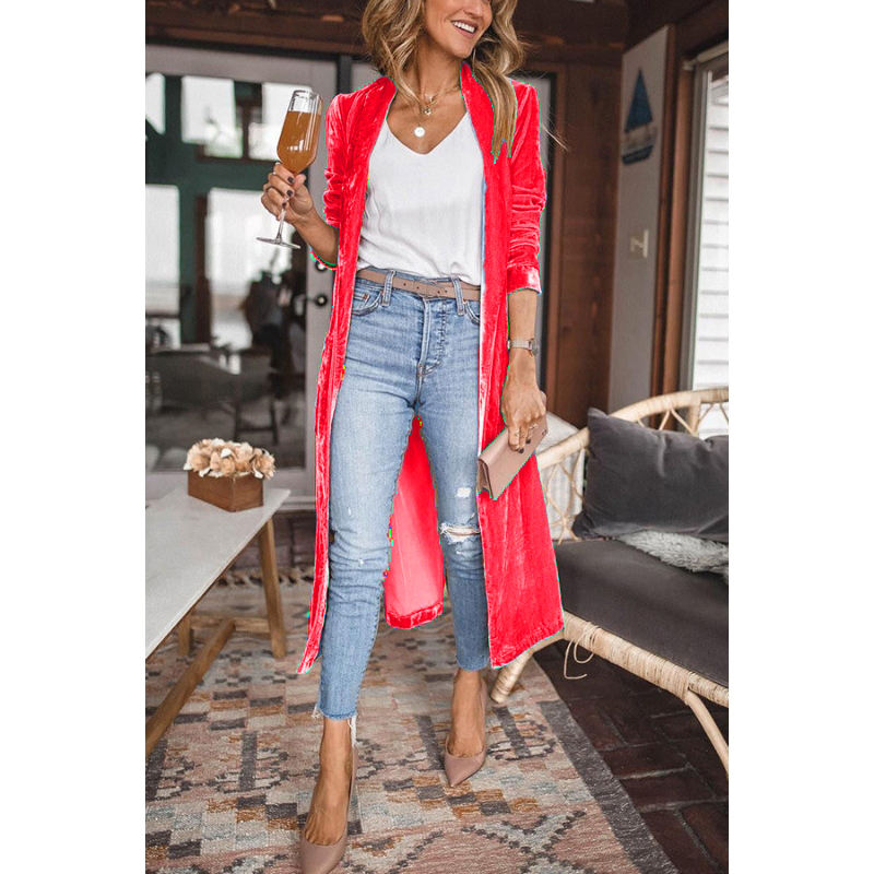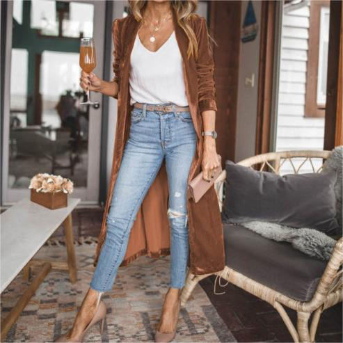 เสื้อคลุมคาร์ดิแกนผู้หญิงผ้ากำมะหยี่สีทองแบบหลวมมีกระเป๋า แฟชั่นเสื้อโค้ทยาว