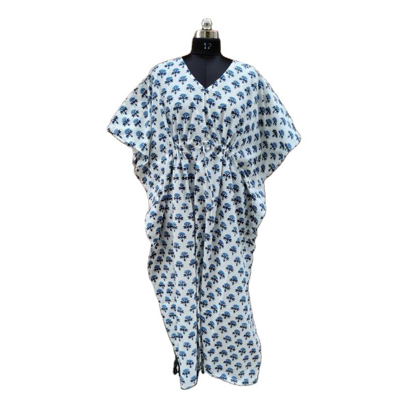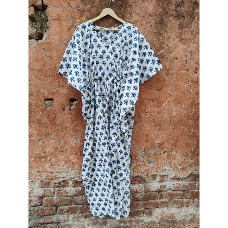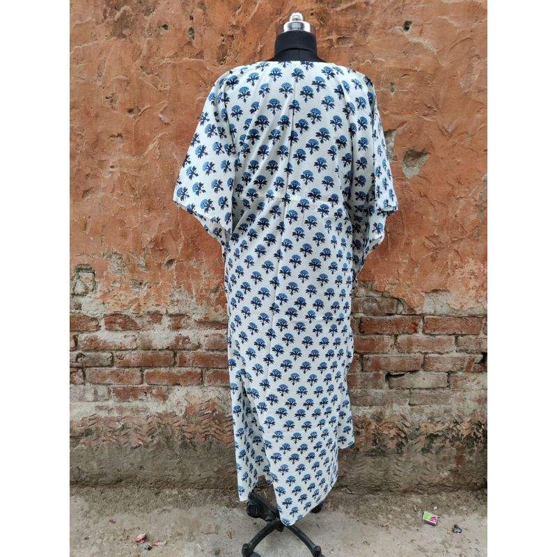 เดรสคาฟตานแบบอินเดียทรงหลวม,ชุดกระโปรงชายหาดเสื้อคลุมอินเดียผ้าฝ้ายลายดอกไม้นุ่มสบายพิมพ์ลายบล็อกมือ