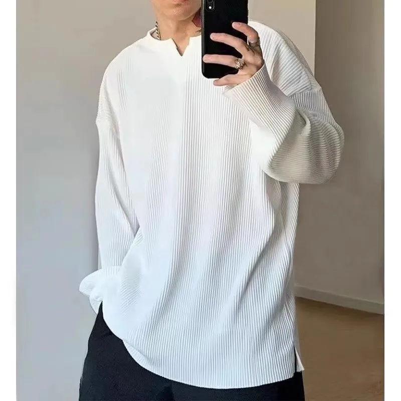 เสื้อยืดแขนยาวทรงหลวมแบบรัดรูปสำหรับออกกำลังกายผู้ชาย ฤดูใบไม้ร่วงและฤดูหนาว ลายทาง คอวี คอเฮนลีย์ จีบ ยืดหยุ่นสูง
