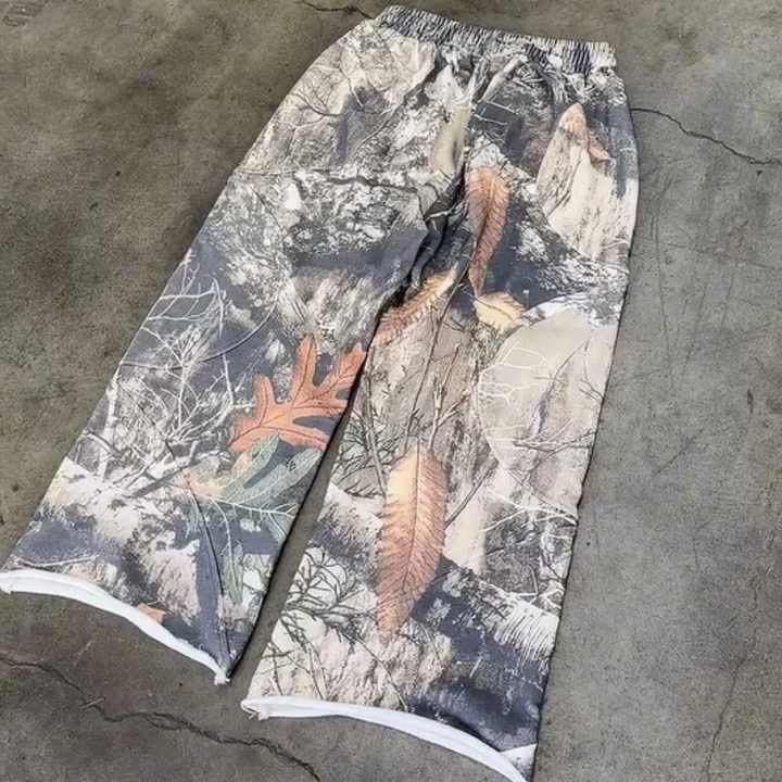 กางเกงขายาวลำลองปักลายหลวมๆ สำหรับผู้ชาย ผ้าฝ้าย 100% เอวกลาง ทรงหลวม ลายพรางต้นไม้