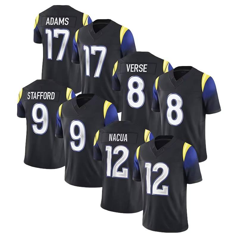 เสื้อแข่งชายของลอสแอนเจลิส แรมส์ # 12 นาควา # 8 บทกลอน # 9 สแตฟฟอร์ด # เสื้อฟุตบอลอัดัมส์สีดำหมายเลข 17