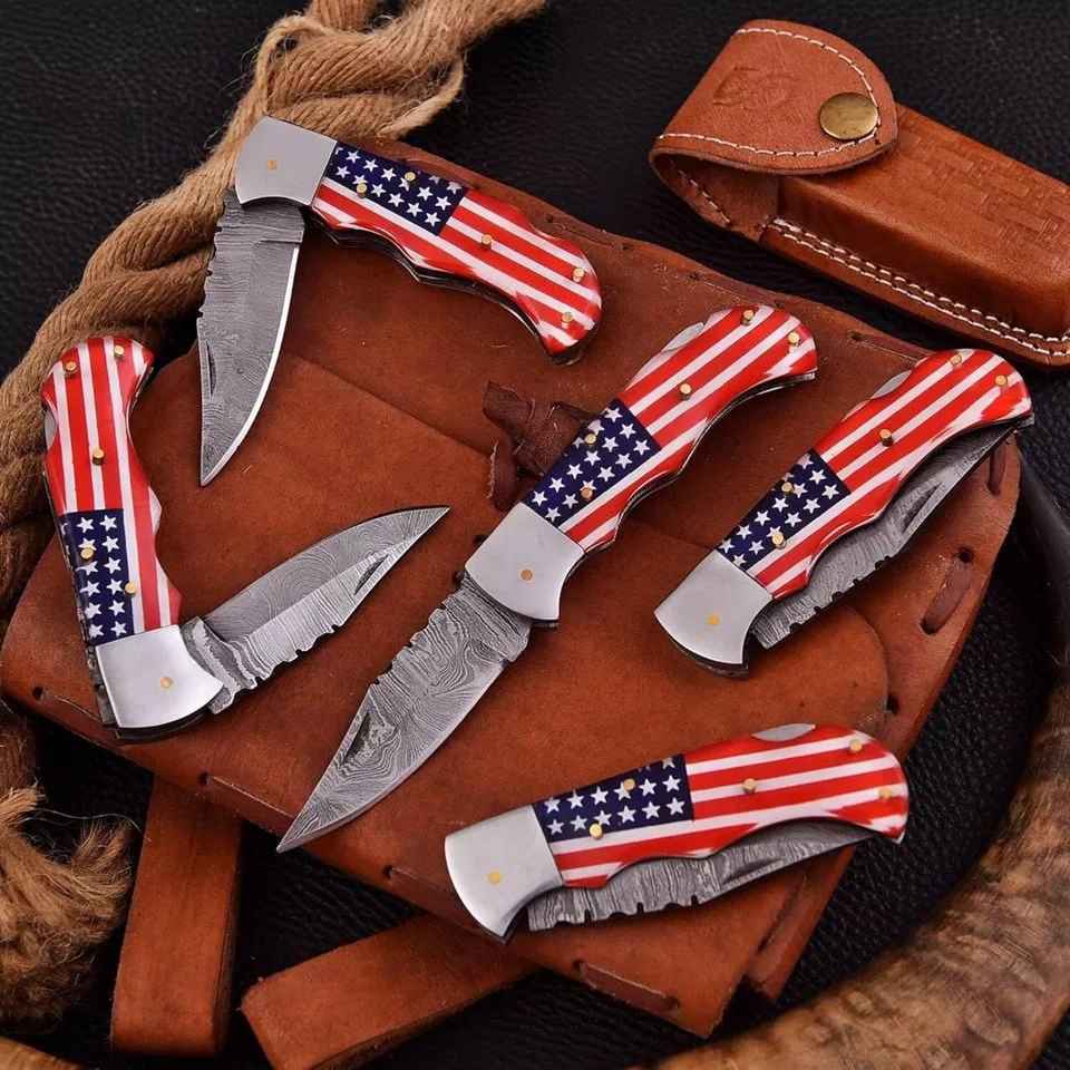 USA Flag Handmade Fixed Blade Knife Damascus Steel Blade DIY OEM