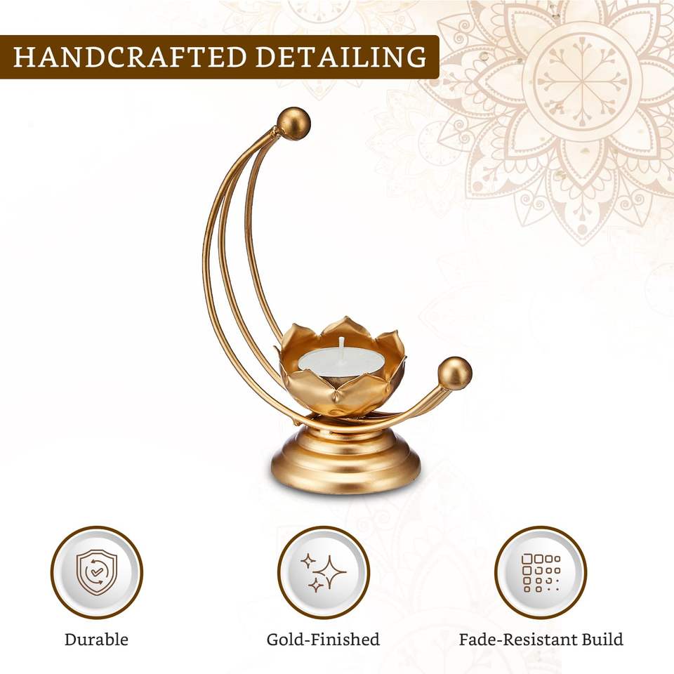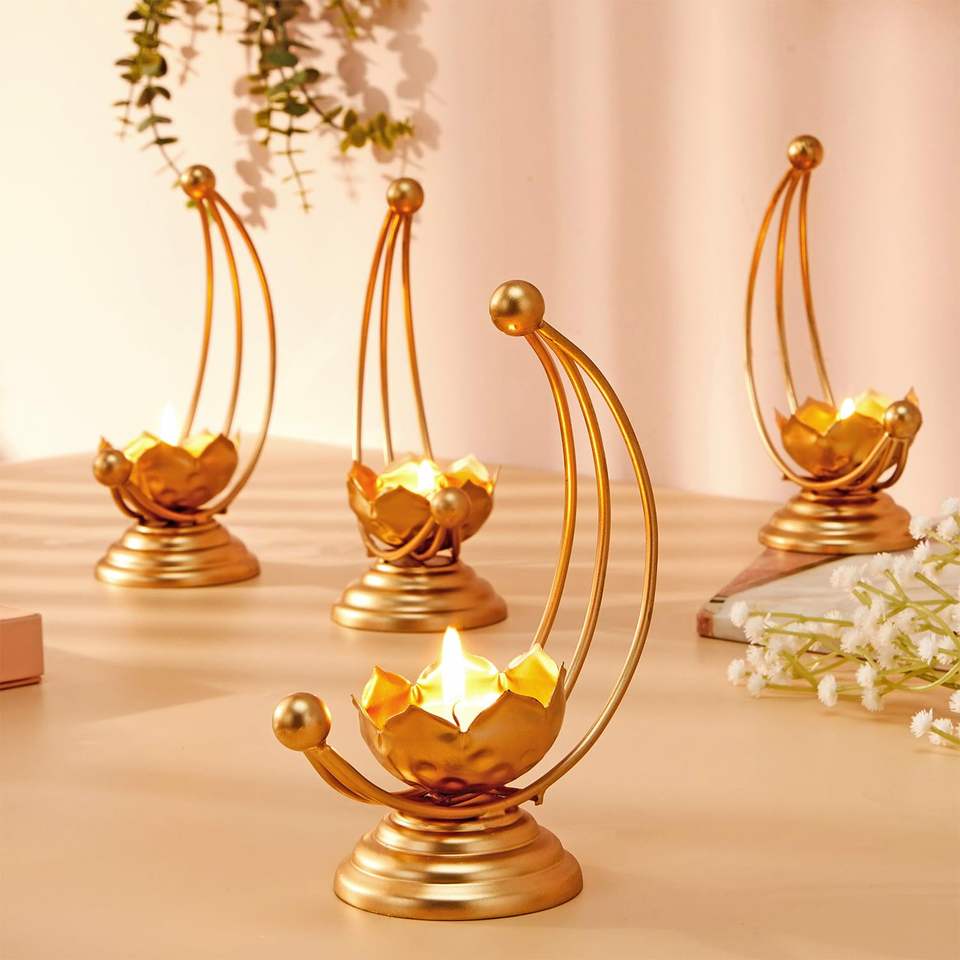 ชุดเชิงเทียนโลตัสเหล็กสีเขียวอมฟ้า ตกแต่งด้วยดอกไม้สีทอง เหมาะสำหรับตกแต่งบ้านในเทศกาลคริสต์มาส ของตกแต่งโต๊ะสไตล์โมเดิร์น