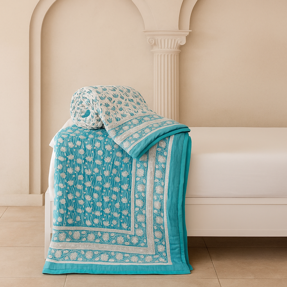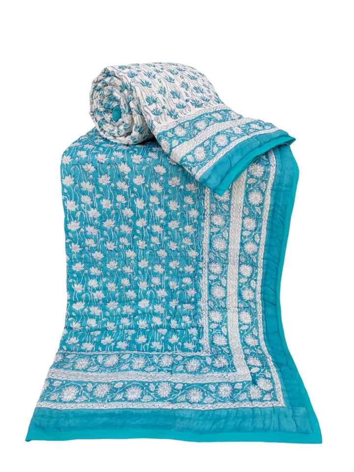 ผ้าห่มลายดอกไม้ลายดอกบัวผ้าคอตตอนสีฟ้าอ่อน, เตียงเดี่ยวแบบกลับด้านได้ผ้าคลุมเตียงมือพิมพ์ลายเป็นมิตรกับสิ่งแวดล้อมซักเครื่องได้