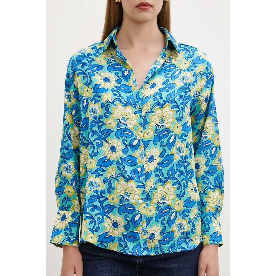 เสื้อเชิ้ตติดกระดุมลายดอกบัวผู้หญิงสีฟ้าพิมพ์ลายดอกไม้ป๊อปลินสไตล์ลำลองทุกวัน
