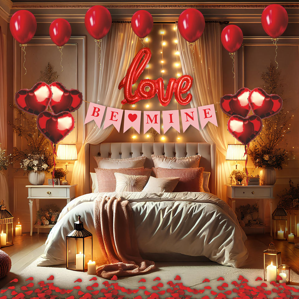 ชุดคอมโบพรีเมียมสีแดง Love Be Mine | 15 ชิ้น ลูกโป่งสีแดง ลูกโป่งฟอยล์รูปหัวใจและความรัก | รักฉันเถอะ สายสะพายและป้ายประดับ