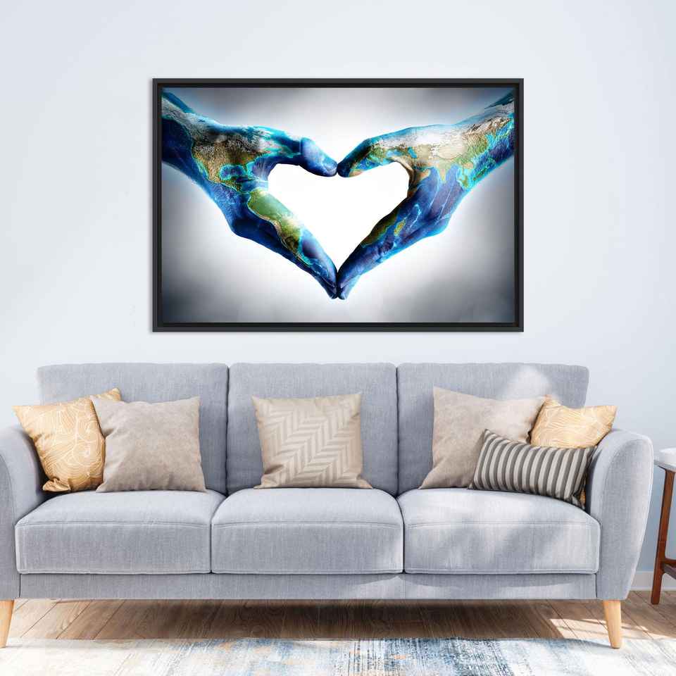 ภาพพิมพ์บนผ้าใบ Love Planet: งานศิลปะรูปหัวใจและมือสไตล์โมเดิร์น ภาพพิมพ์บนผ้าใบกรอบสีดำ