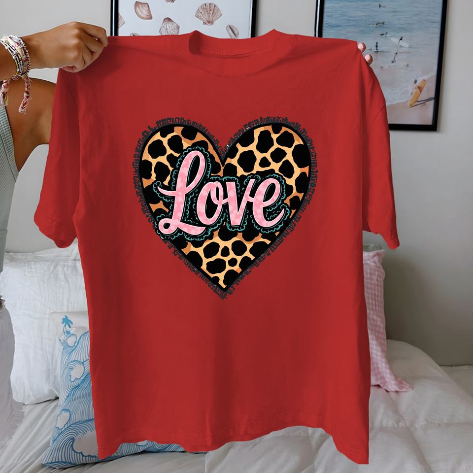 เสื้อยืดผู้หญิงแขนสั้นผ้าฝ้าย 100% ลายหัวใจเสือดาว สวมใส่สบาย