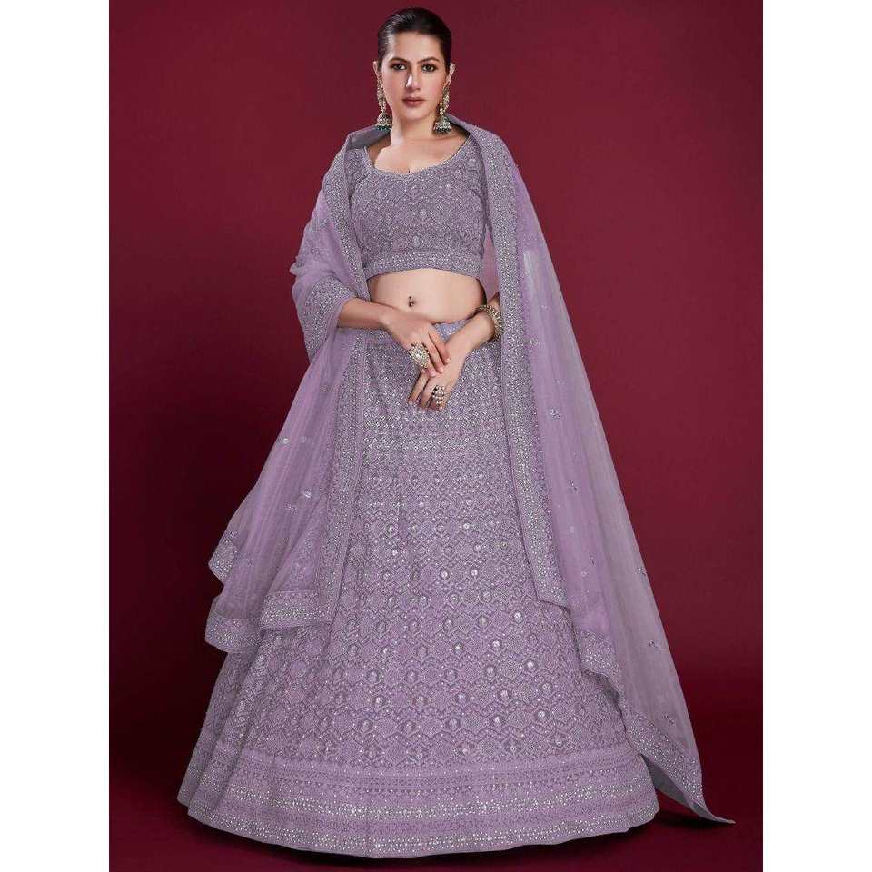 ชุดราตรีผ้าจอร์เจตต์ปักลายลาเวนเดอร์สวยงาม ชุดเลเฮนกาโชลีหรูหราสำหรับงานแต่งงาน