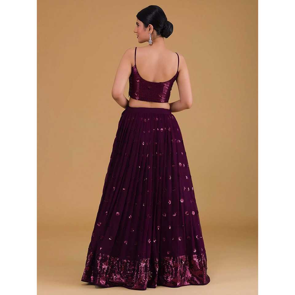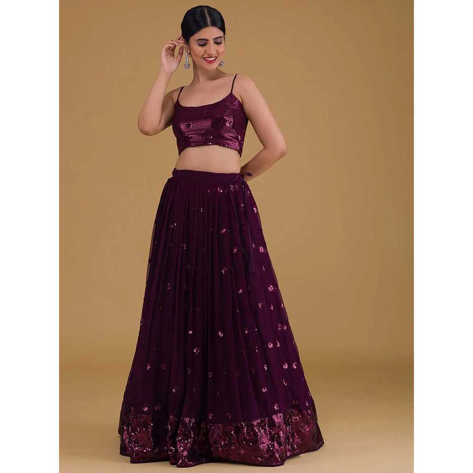 ชุดราตรีผ้าจอร์เจียต์ปักลายสีม่วงสวยงาม ชุดเลเฮนกาโชลีสำหรับงานเลี้ยงสุดหรู