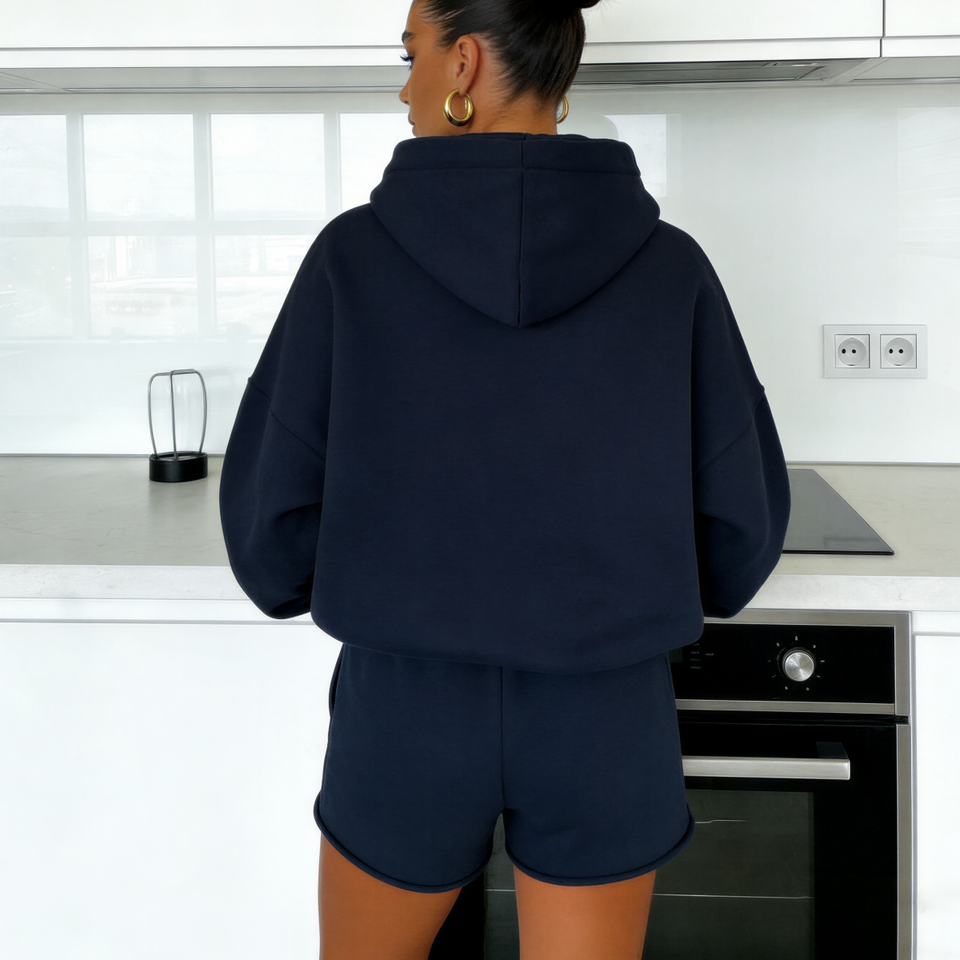 ชุดเซ็ตสองชิ้นผู้หญิงราคาส่งถูก รับทำโลโก้ เสื้อฮู้ดดี้โอเวอร์ไซส์ กางเกงขาสั้น ชุดลำลองสำหรับฤดูร้อนและฤดูใบไม้ร่วง เสื้อผ้าสตรีทแวร์
