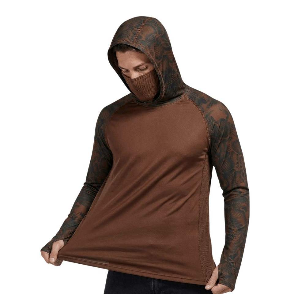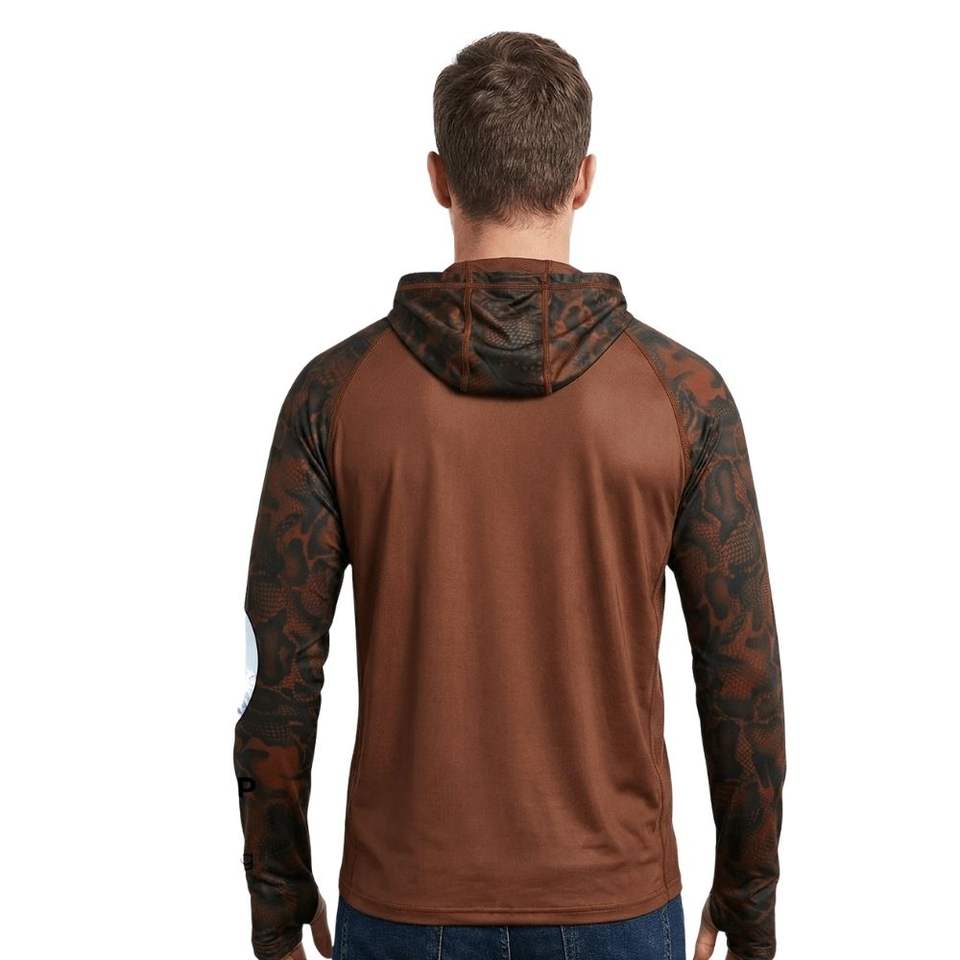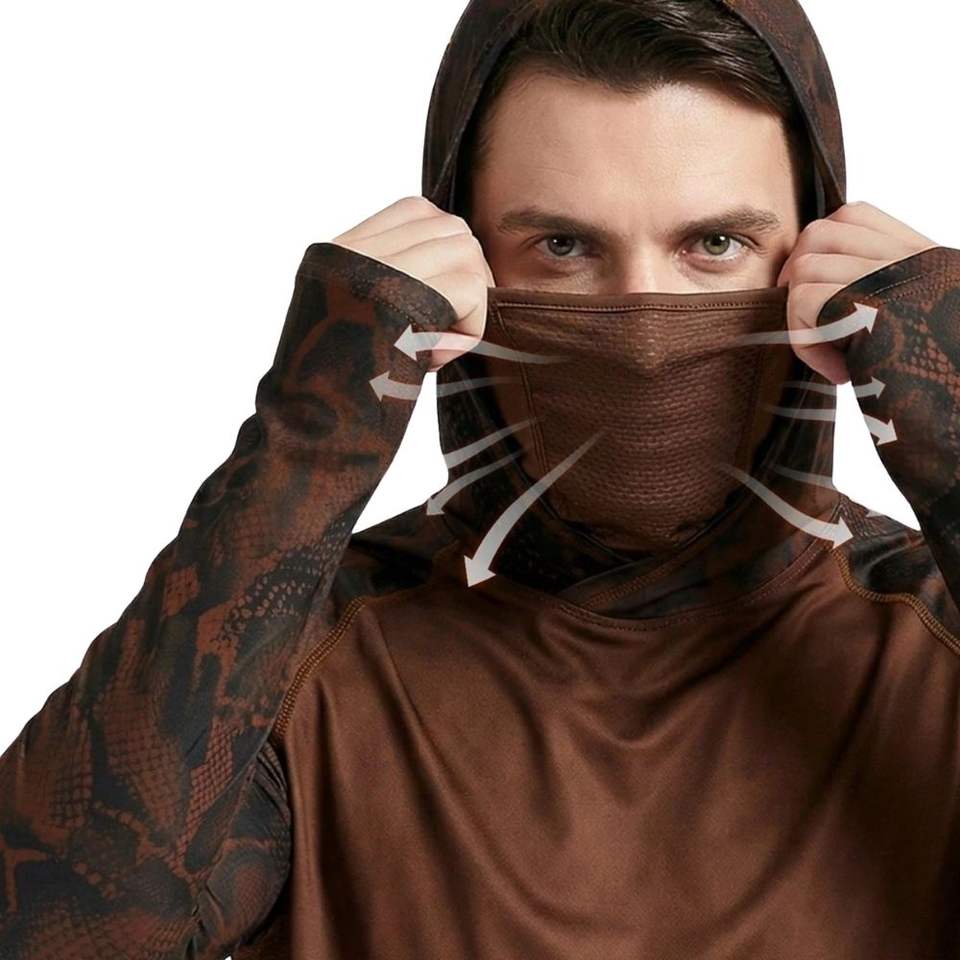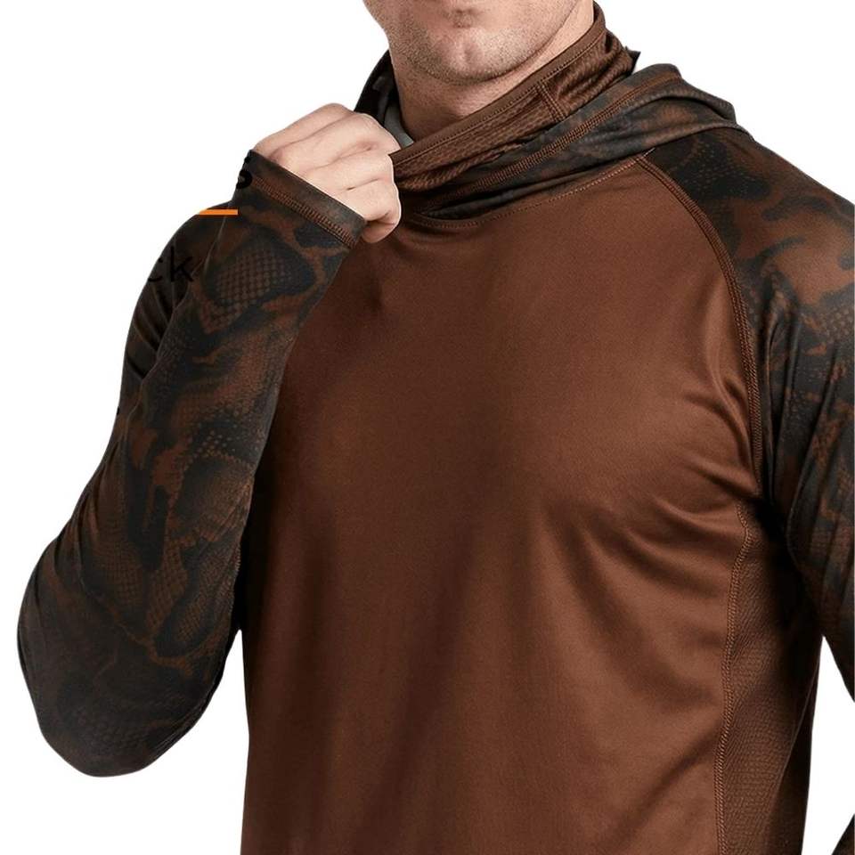 เสื้อตกปลาแบบสั่งทำพิเศษ ป้องกันแสงแดด พิมพ์ลายแบบซับลิเมชั่น MOQ ต่ำ เสื้อฮู้ดทีมตกปลาผ้าโพลีเอสเตอร์แห้งเร็ว พร้อมหน้ากาก