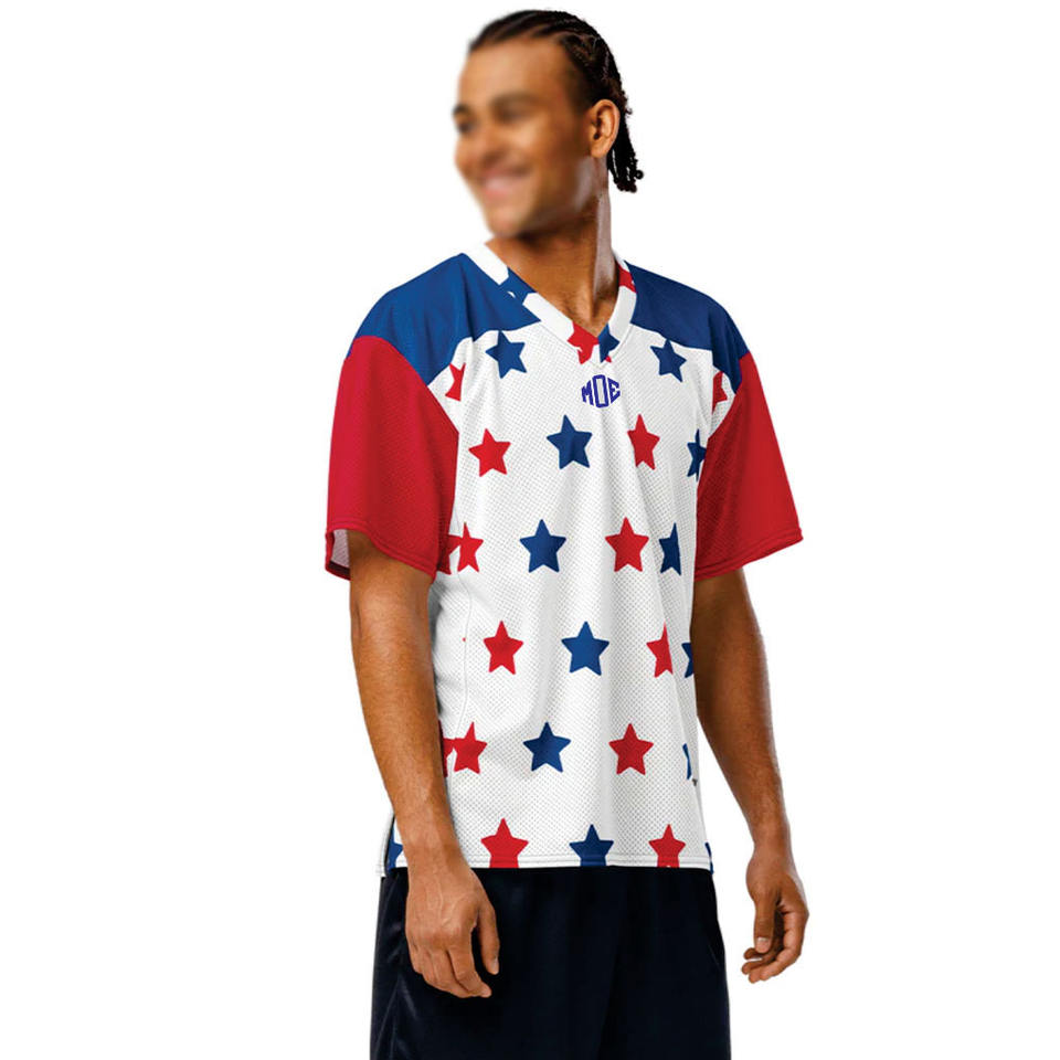 เสื้อเจอร์ซีย์อเมริกันฟุตบอลพิมพ์ลายดาว สตรีทแวร์สั่งทำได้ MOQ ต่ำ ระบายอากาศได้ดี ผลิตภัณฑ์กีฬาตาข่าย รับผลิตแบบ OEM แบรนด์ส่วนตัว สั่งซื้อจำนวนมากได้