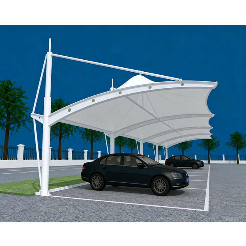โครงสร้างจอดรถแบบกันสาดแรงดึง ติดตั้งง่าย ไม่ต้องบำรุงรักษามาก โครงสร้างกันสาดแบบคานยื่น โครงสร้างกันสาดแบบดึง โครงสร้างหลังคาจอดรถ ที่จอดรถแบบมีหลังคา