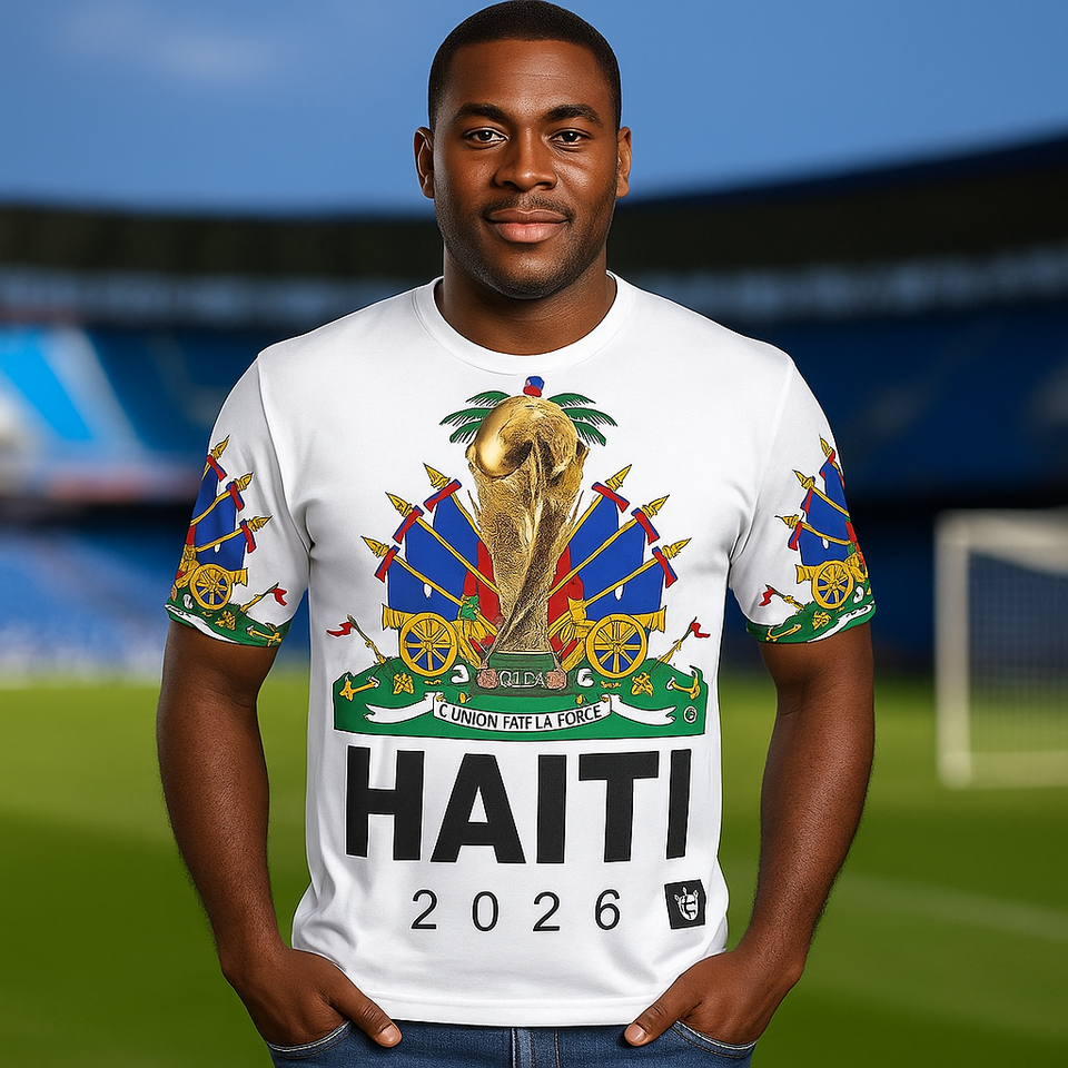 เสื้อฟุตบอลโพลีเอสเตอร์ระบายอากาศดี ดีไซน์ฟุตบอลโลก 2026 ลายธงชาติเฮติ รับสั่งทำตามแบบ ไซส์ใหญ่พิเศษสำหรับผู้ชาย