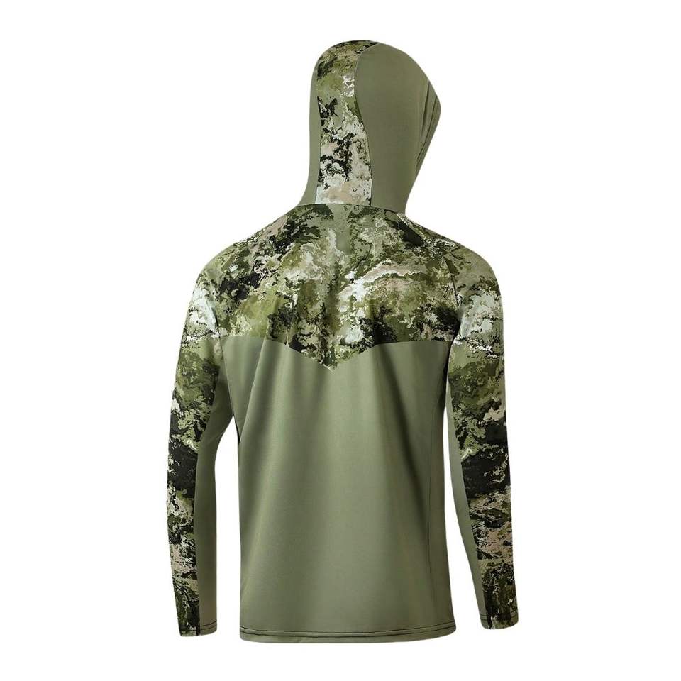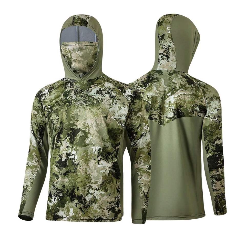 เสื้อผ้าตกปลาแบบกันน้ำพิมพ์ลายตามสั่ง MOQ ต่ำ ป้องกันแสงแดด ผลิตจากผ้าสแปนเด็กซ์/โพลีเอสเตอร์ พร้อมฮู้ดและหน้ากากปิดหน้า