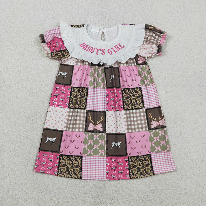 ชุดเดรสเด็กผู้หญิง Low Moq ลายสก็อตสีชมพู ปักลาย Daddy's Girl ประดับโบว์ ลายสุนัข ชุดเดรสฤดูร้อนสำหรับเด็กผู้หญิง ความยาวระดับเข่า แบบสม็อค