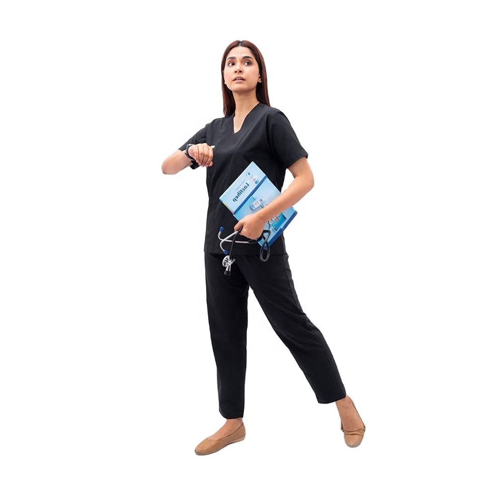 ชุดพยาบาลสำหรับผู้หญิงแขนสั้นสีดำดีไซน์อินเทรนด์ชุดพยาบาลสำหรับใส่ในคลินิกทางการแพทย์แบบปรับแต่งได้