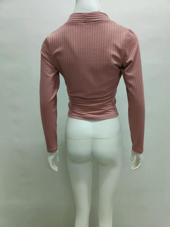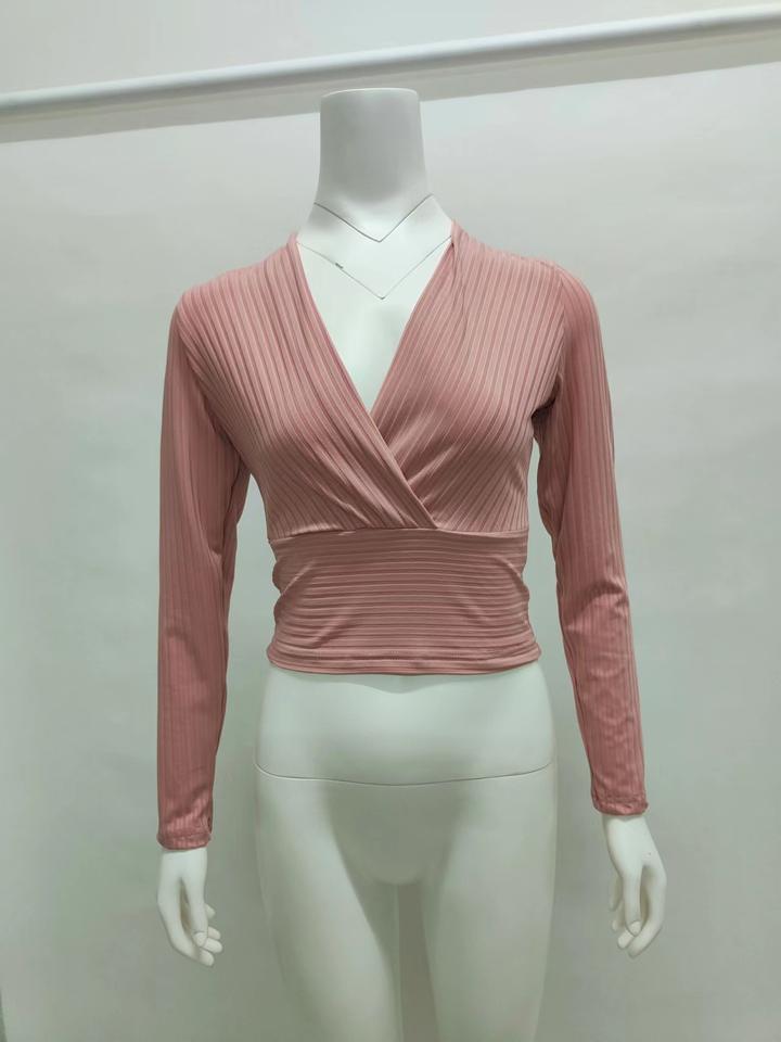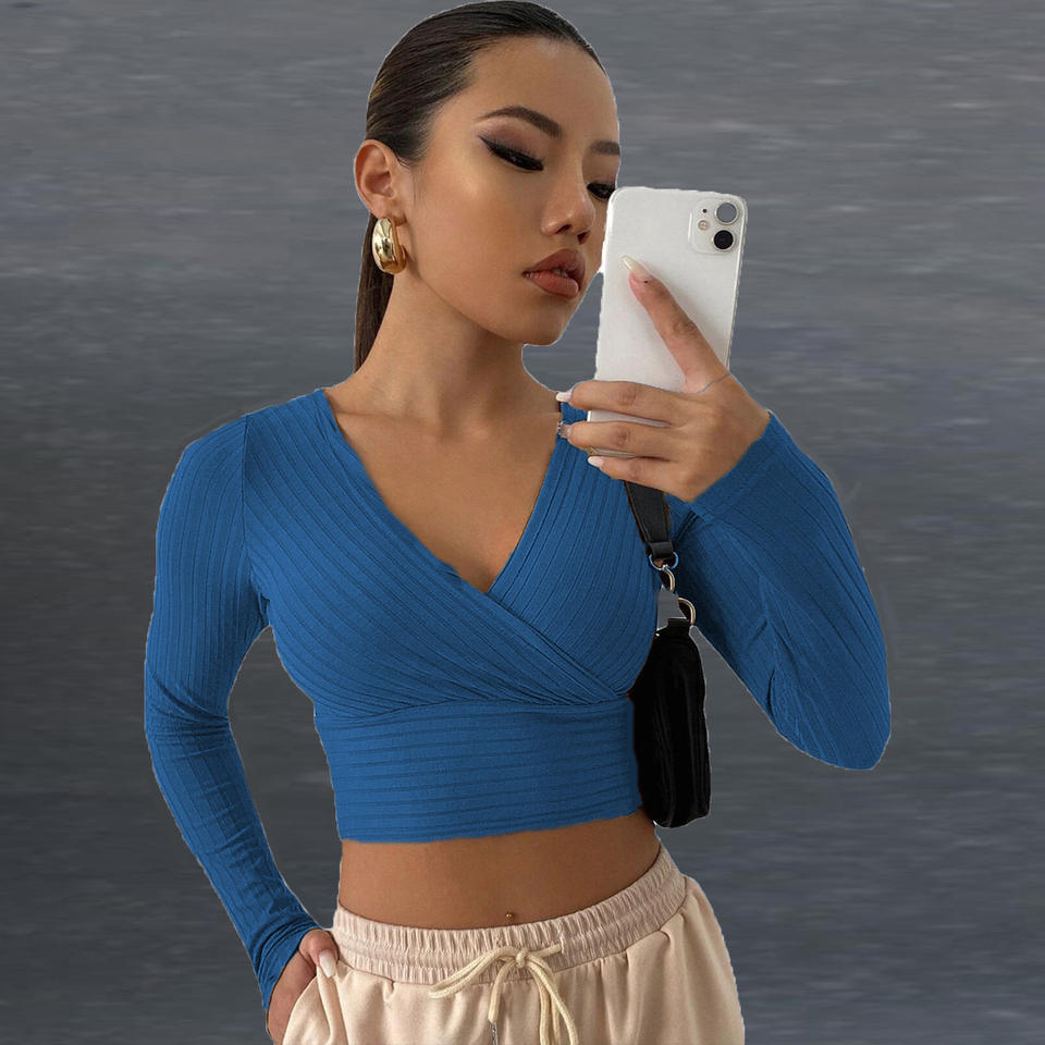 เสื้อครอปคอวีลึกเซ็กซี่ราคาถูกสำหรับผู้หญิง ขายส่งเสื้อครอปแขนยาวผ้าริบ