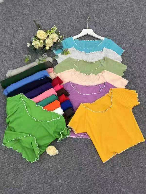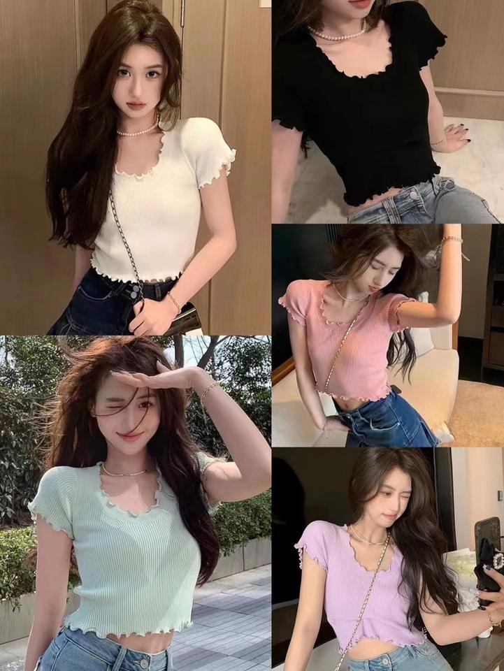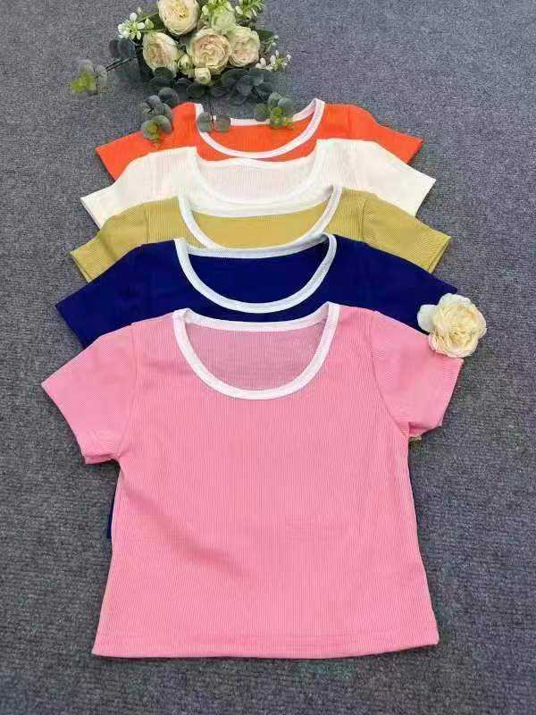 เสื้อยืดแขนสั้นสำหรับผู้หญิงเสื้อครอปสั้นผ้าถักลำลองสีพื้นสำหรับฤดูร้อน