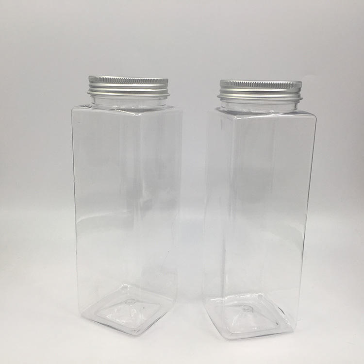 ขวดน้ำผลไม้พลาสติกทรงเหลี่ยม 500 มล. ราคาประหยัด พร้อมสกรีนพิมพ์และฝาอลูมิเนียมสำหรับเครื่องดื่มเย็น