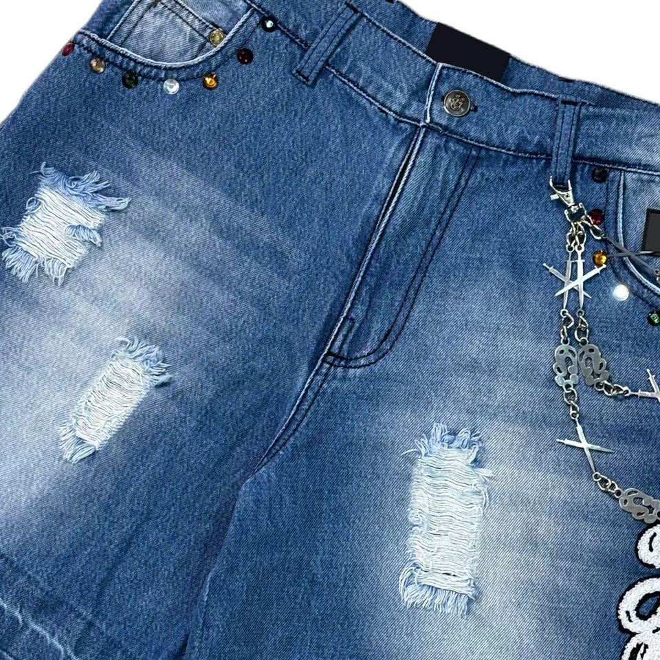 กางเกงขาสั้นยีนส์ประดับพลอยเทียมสำหรับผู้ชาย