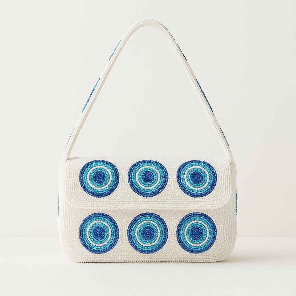 กระเป๋าถือสะพายไหล่ลูกปัดสีขาวลายตาปีศาจ ราคาประหยัด พร้อมฝาปิดผ้าลายวงกลมสีน้ำเงิน สำหรับผู้หญิง แฟชั่นงานปาร์ตี้ ฤดูร้อน ชายหาด