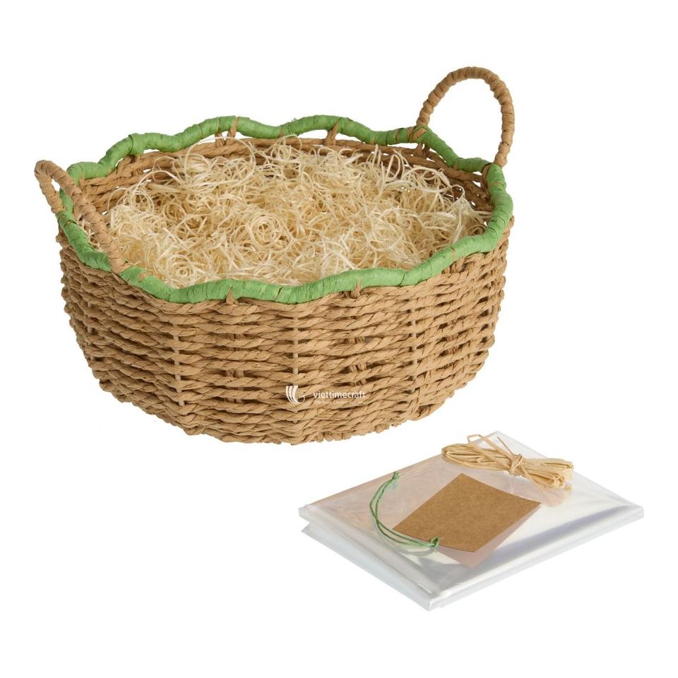 ตะกร้าสานจากฟางกระดาษทรงเตี้ย ขอบหยัก งานฝีมือทำมือ ตะกร้าของขวัญตกแต่งพร้อมหูจับคู่ ขายส่ง งานฝีมือเวียดนาม