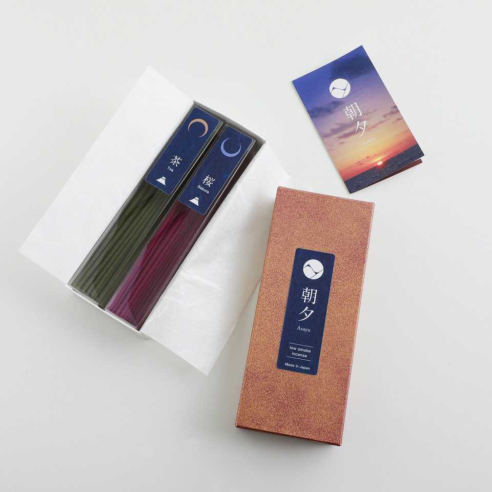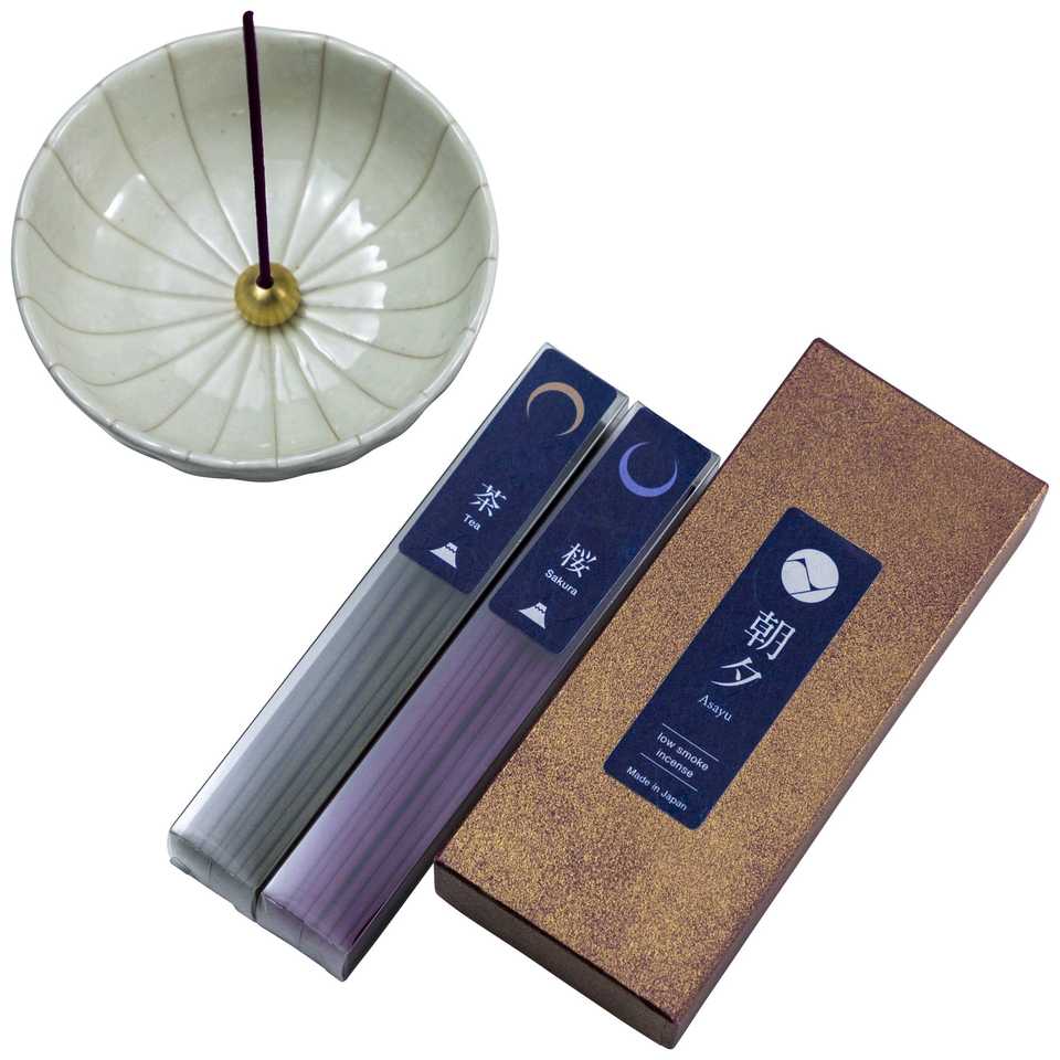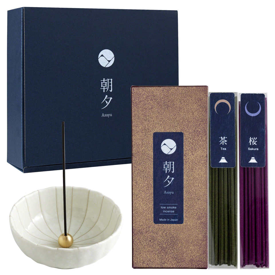 ชุดของขวัญธูปควันน้อยจากญี่ปุ่น: กลิ่นซากุระและชาเขียว พร้อมที่วางธูปรูปดอกบัวสีขาว