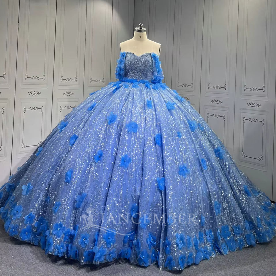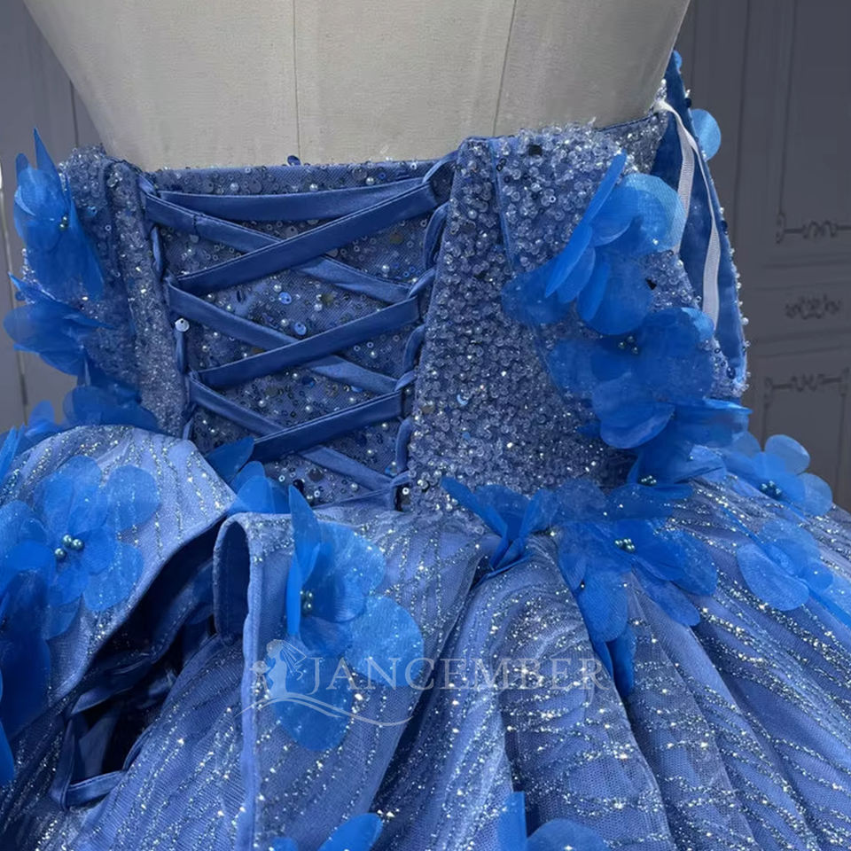 ชุดเดรสงาน Quinceanera สีฟ้าอ่อน รุ่น Lsmu149 ทรงบอลกาวน์ ผ้าออร์แกนซ่าจับจีบ ประดับลูกปัด ดอกไม้ 3 มิติ สำหรับงานวันเกิด เจ้าหญิง คอเสื้อแบบ Sweetheart สีธรรมชาติ