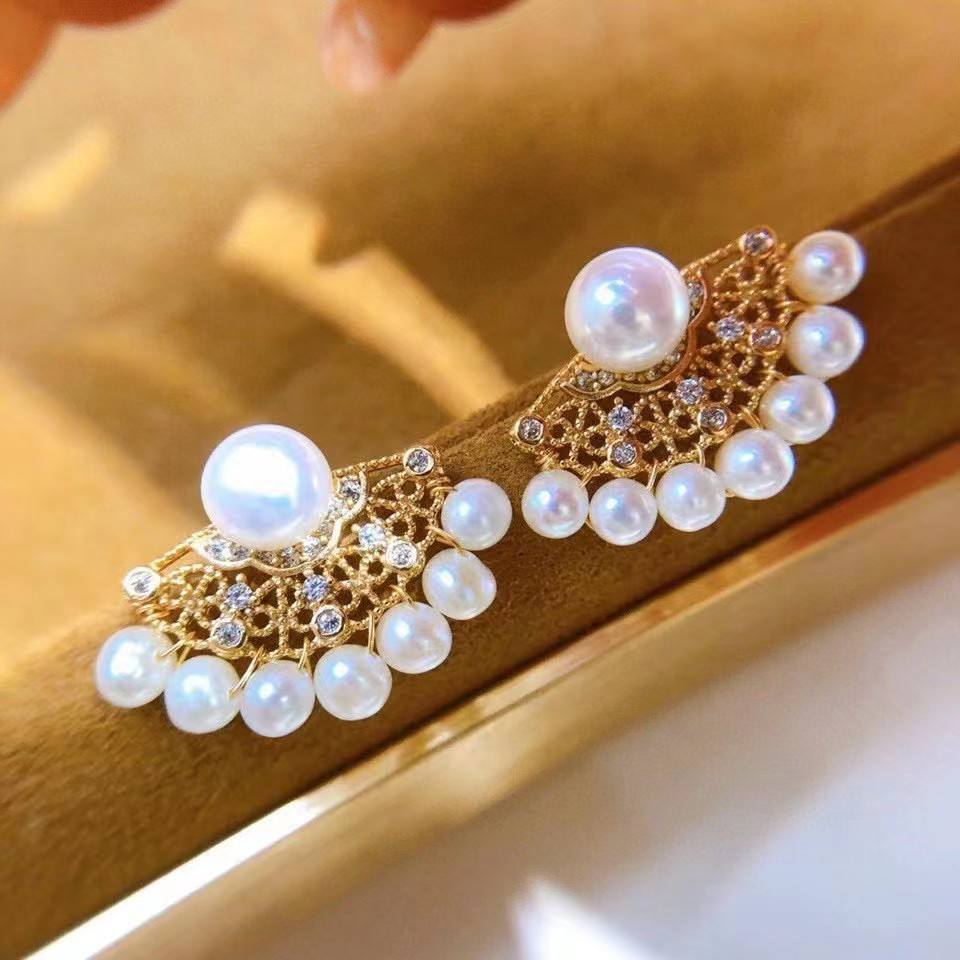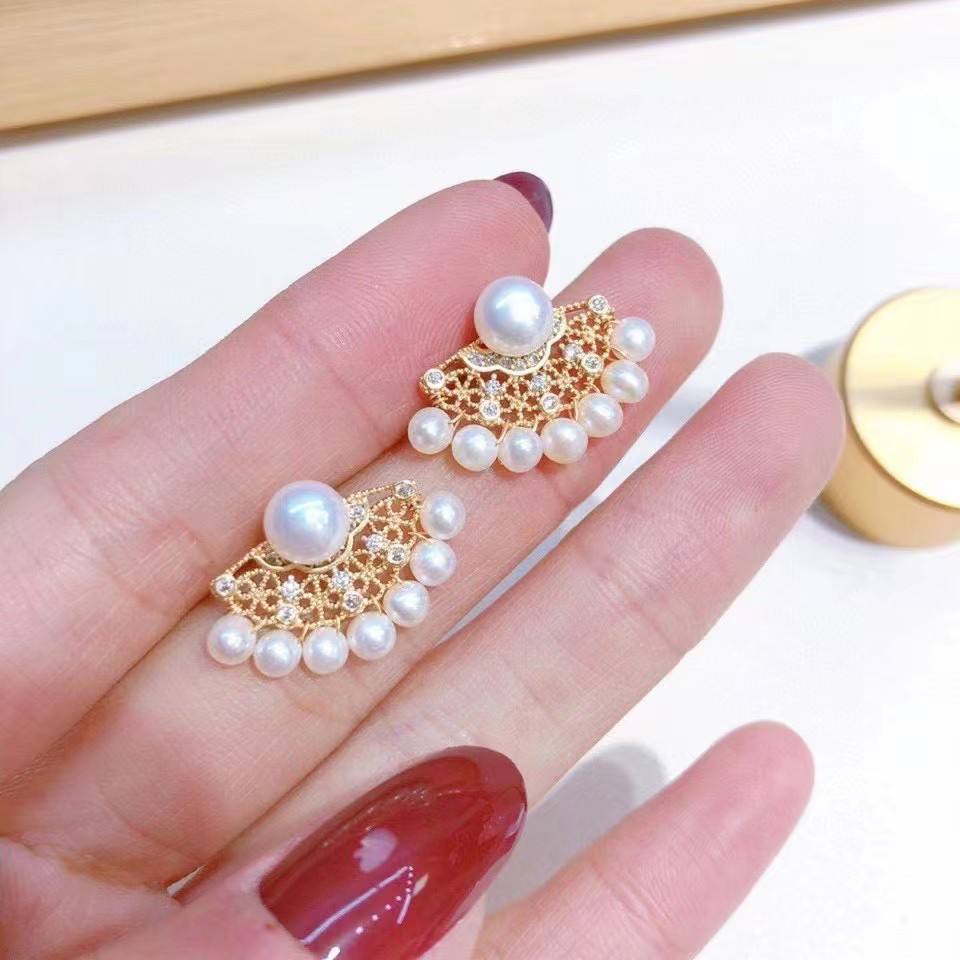 Lu Kong Design Republic China Feather Fan Style Pure Silver 3-6 Freshwater Pearl Dangle Earrings New Product Recommendation