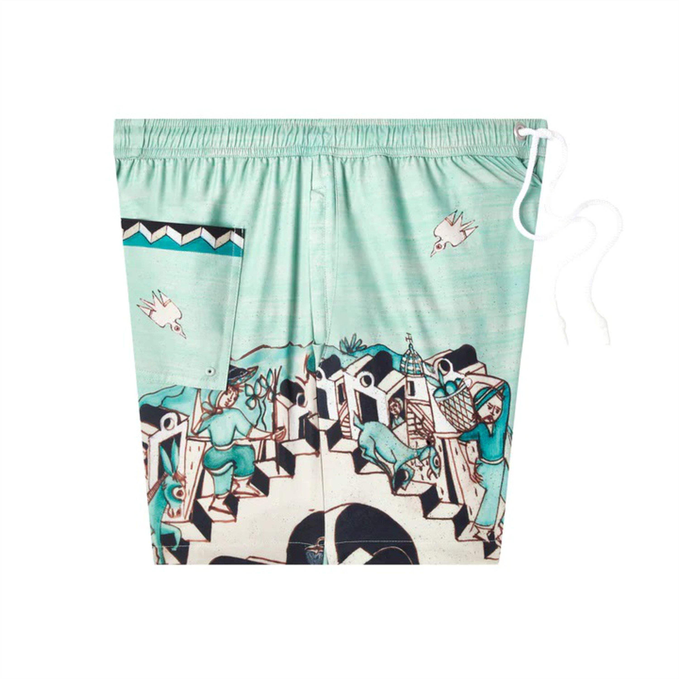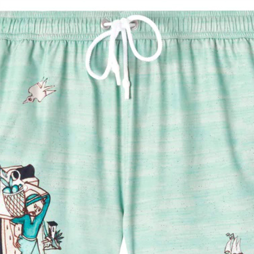 กางเกงว่ายน้ำขาสั้น Lucio liguori แสดงฉากแนวสตรีทที่วาดด้วยมือสแกนและจับคู่กับวัสดุที่เป็นมิตรต่อสิ่งแวดล้อม