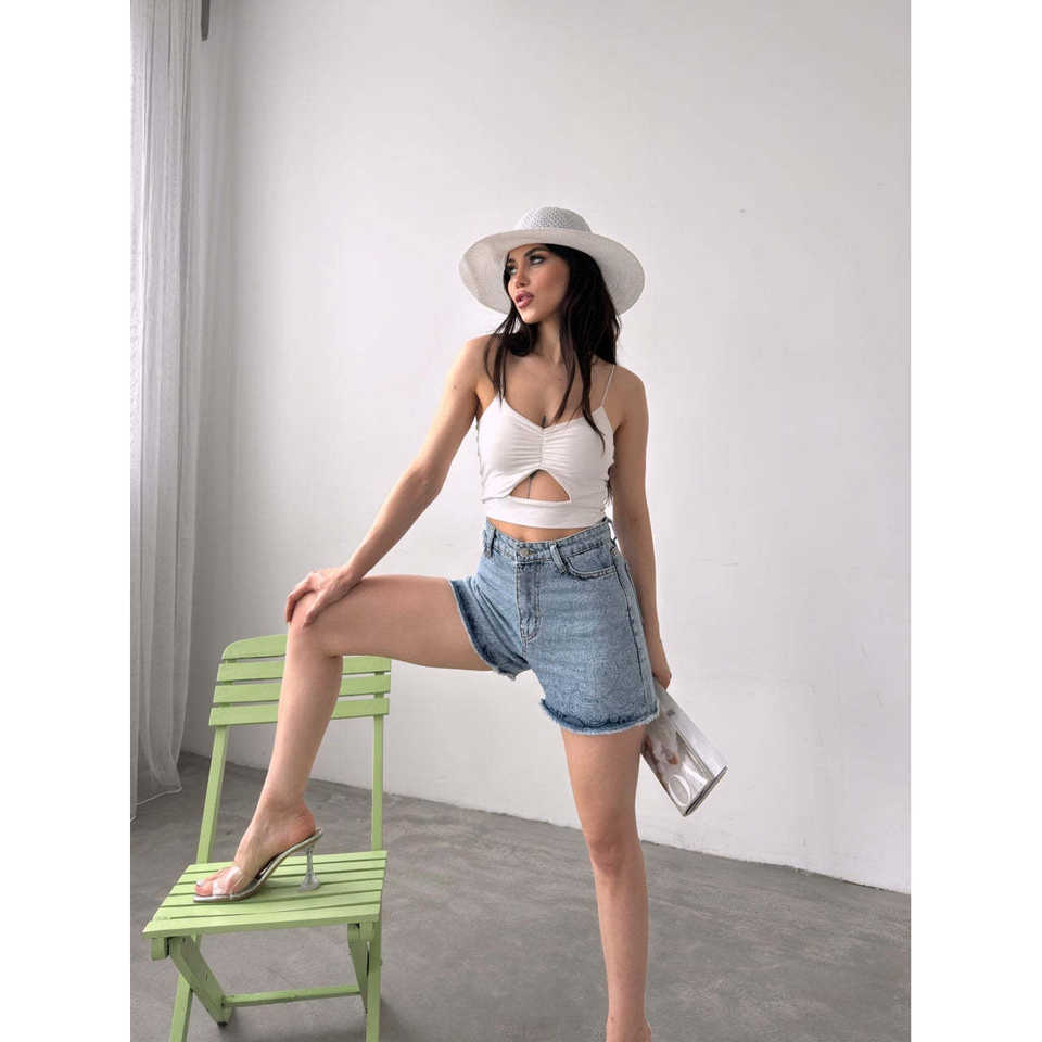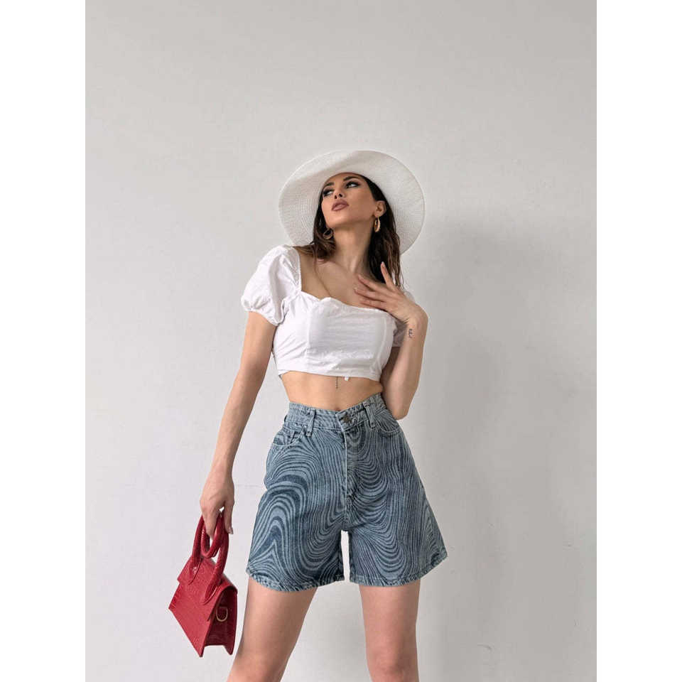กางเกงยีนส์ขาสั้นผู้หญิงแบรนด์ลัคกี้ สีฟ้าอ่อน ทรงขาตรง พิมพ์ลายชายไม่สมมาตร เอวสูง ผ้าฝ้าย 100% สไตล์ฤดูร้อน