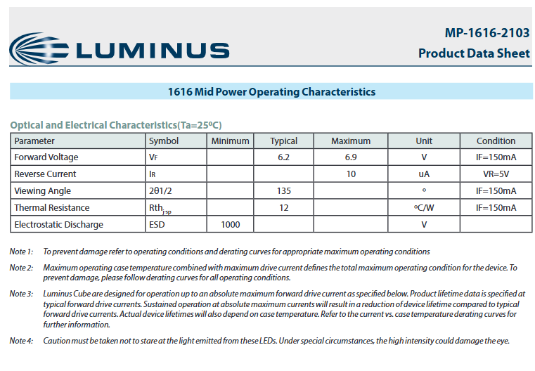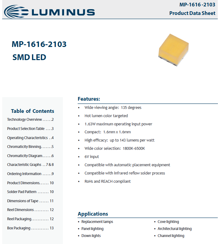 ชิป LED รุ่น Luminuss MP-1616-2103-18-90 ซีรีส์ MP-1616 แสงวอร์มไวท์ 1800K 90CRI 6.2V ปรับความสว่างได้ มุมมองภาพ 135 องศา