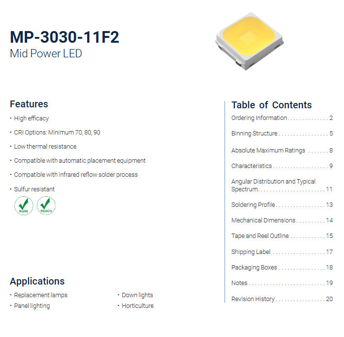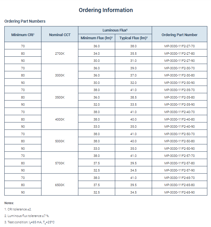 ชิป LED SMD รุ่น Luminuss MP-3030-11F2-40-80 กำลังไฟปานกลาง 3030 สีขาว 4000K Ra90 มุมมองการมองเห็น 120 องศา อายุการใช้งาน 50000 ชั่วโมง