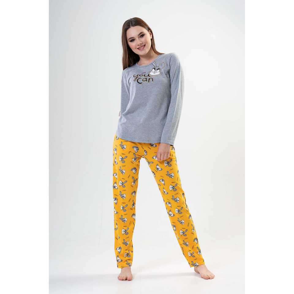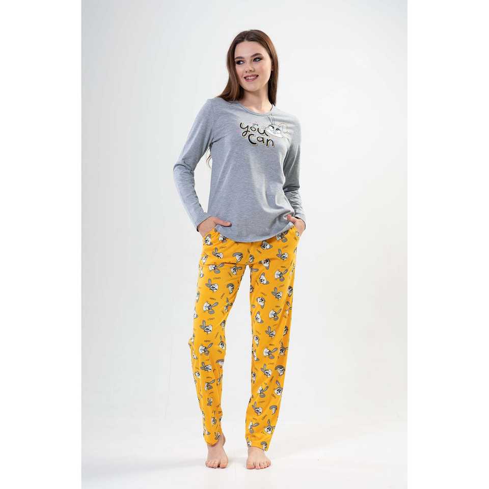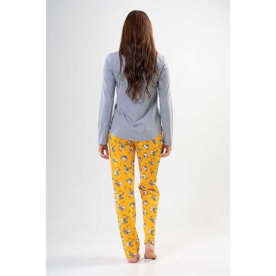 ชุดนอนลูน่าชุดนอนผู้หญิงสีเหลือง ชุดนอนแขนยาวผ้าถักเนื้อนุ่มลำลอง สีเทาผสม
