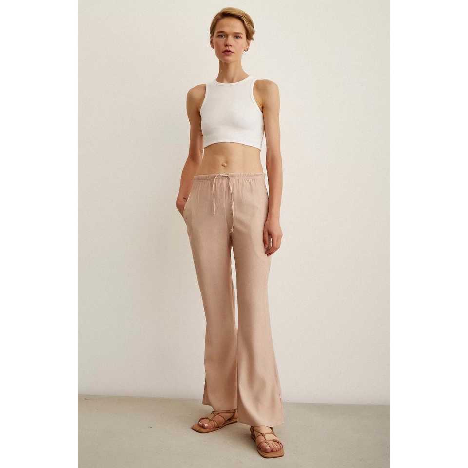 กางเกงขายาวลูน่าสีชมพูพาสเทล ผ้าเครป เอวยางยืด แต่งขอบ ขอบเอวสูง กางเกงผู้หญิง