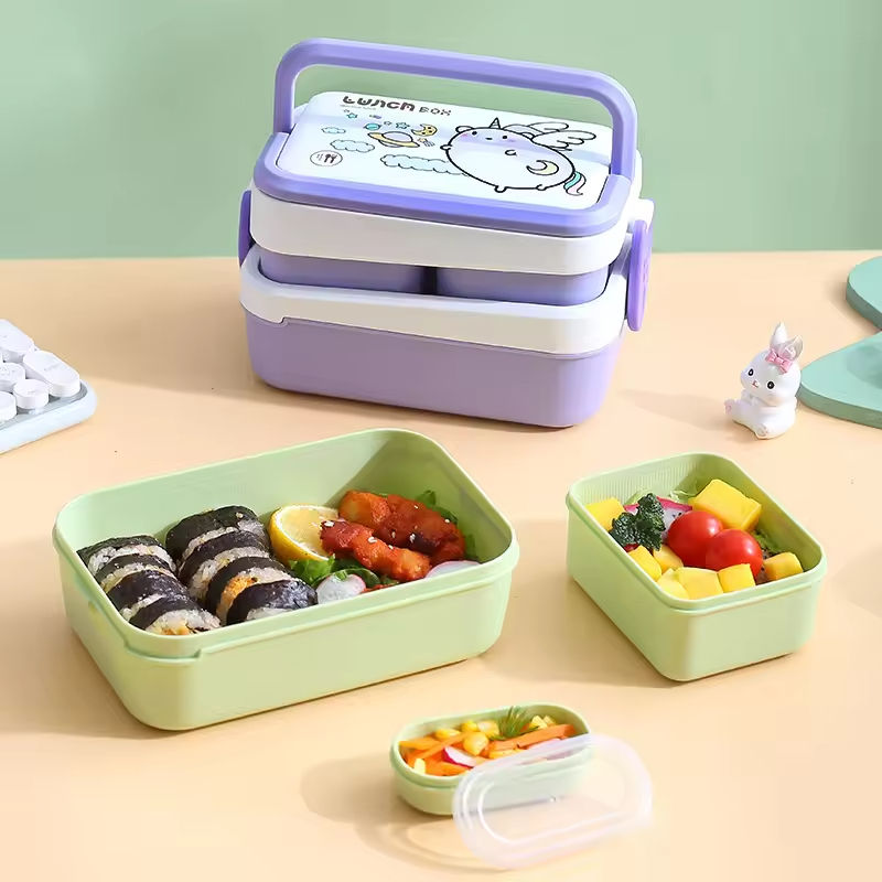 กล่องข้าวพลาสติก PP สำหรับเด็ก พร้อมช้อนส้อม สำหรับโรงเรียน แคมป์ปิ้ง กล่องเก็บอาหาร กล่องเบนโตะ 2 ชั้น มีหูหิ้ว