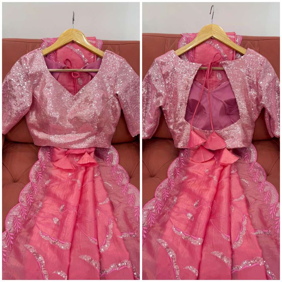 ชุดส่าหรีงานไมโครทันสมัย พร้อมผ้าท็อปสีทองลายครัช และเลเฮนกาชอลีด้านในสำหรับงานปาร์ตี้-แห้งเร็ว