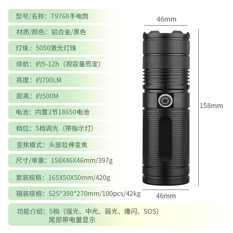 ไฟฉาย LED ชาร์จไฟได้ Luomen T9768 ขนาด 158 มม. ทำจากอลูมิเนียมอัลลอยด์ ให้ความสว่างสูง ใช้กลางแจ้งได้ พร้อมโหมดโฟกัสและ SOS