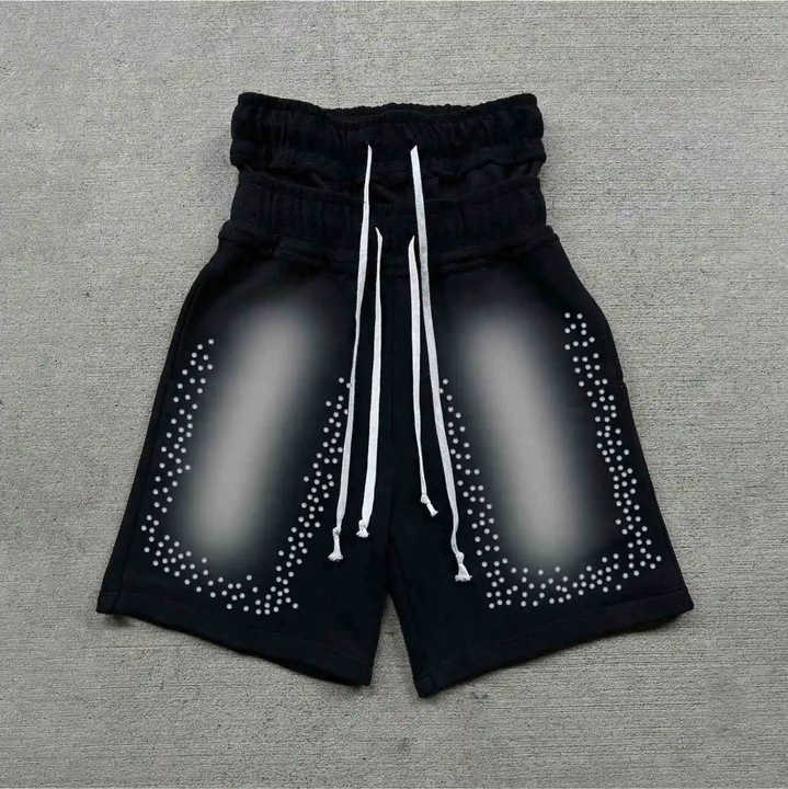 กางเกงขาสั้นจ็อกกิ้งผ้าฝ้ายทรงหลวมสไตล์สตรีทแวร์คุณภาพสูงลายทางเอวคู่สำหรับผู้ชายขายส่ง