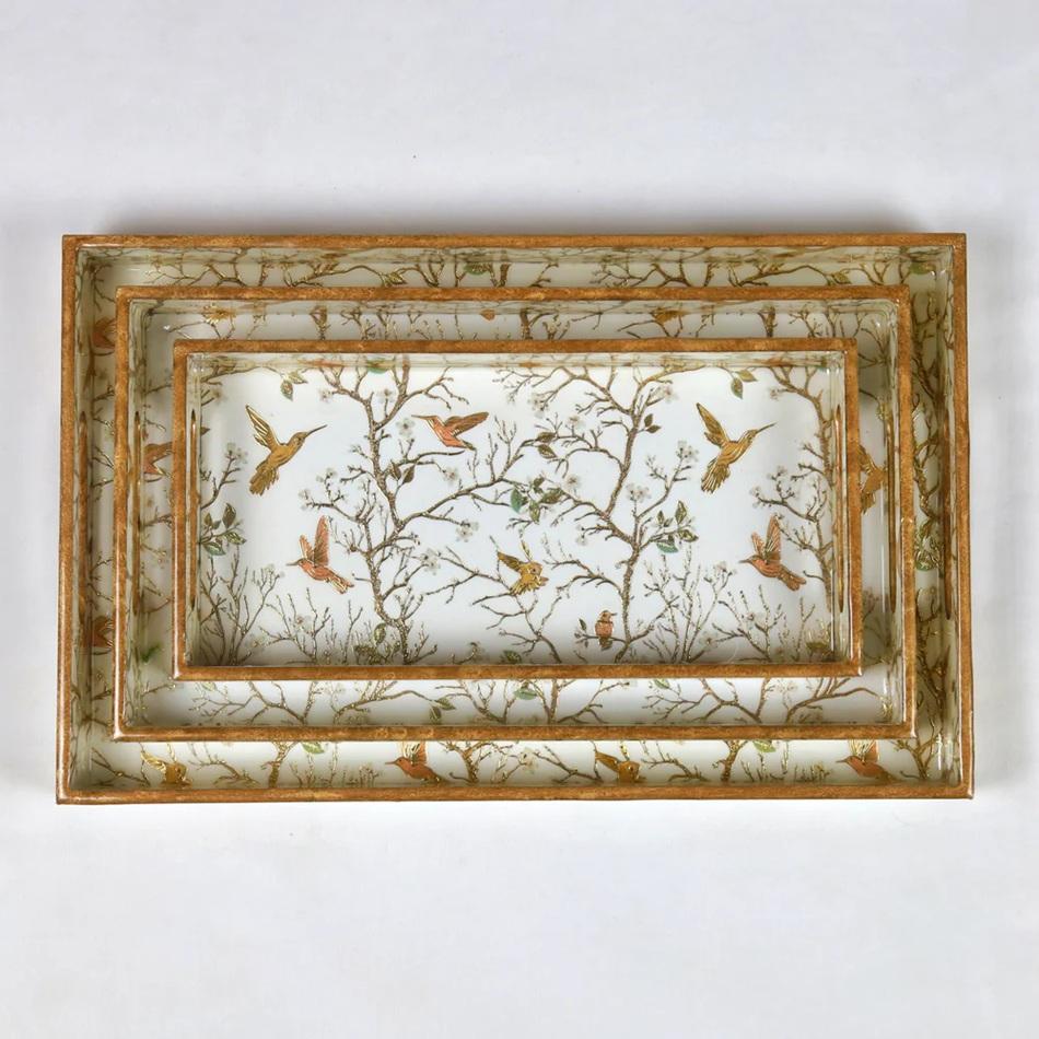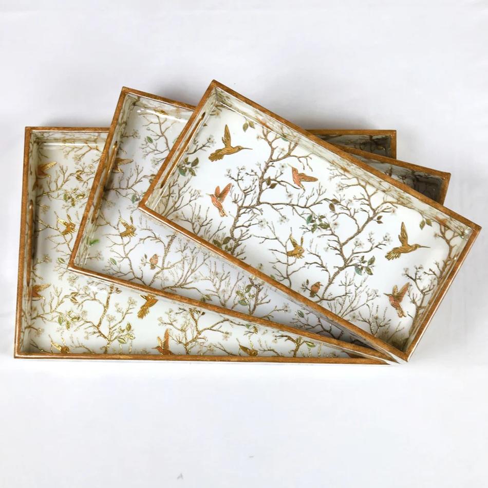 ถาดเสิร์ฟทรงสี่เหลี่ยมผืนผ้าเคลือบเงา ขายส่ง ถาดตกแต่งลายฮัมมิงเบิร์ดและลายพฤกษศาสตร์สุดหรู สำหรับใช้ในบ้านและสั่งซื้อจำนวนมาก