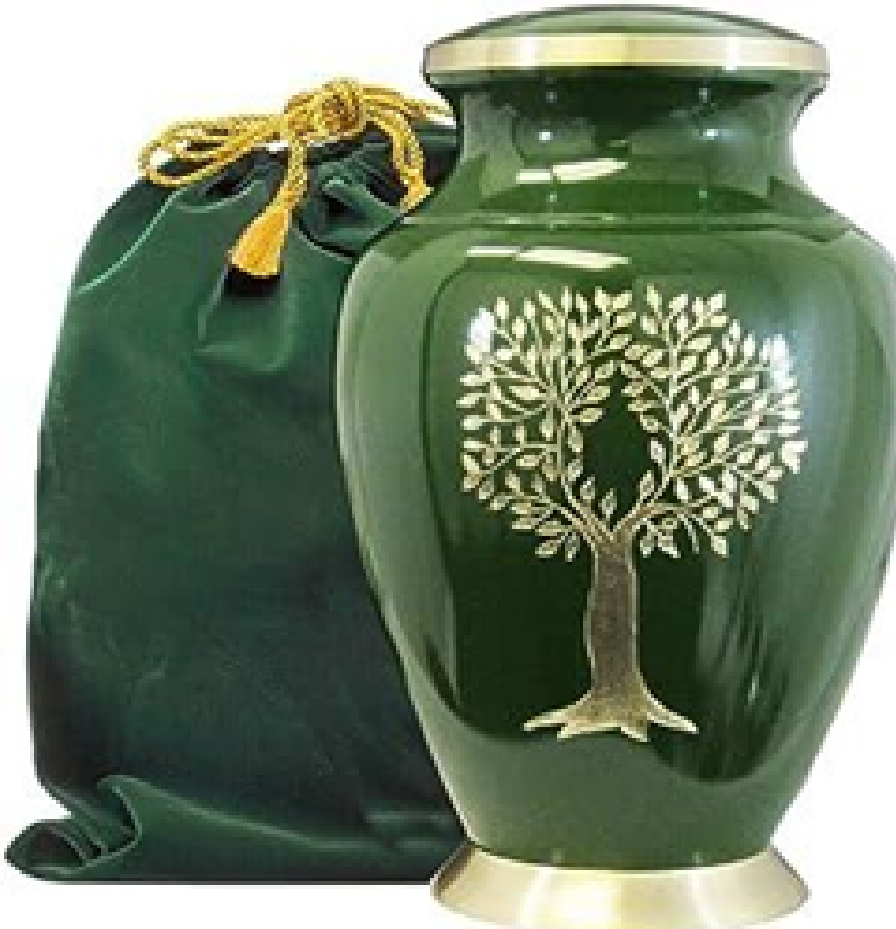 โกศสีเขียวมรกตเงางามพร้อมลาย "ต้นไม้แห่งชีวิต" สีเงิน และถุงกำมะหยี่เข้าชุด สง่างาม มีจำหน่ายในราคาขายส่ง