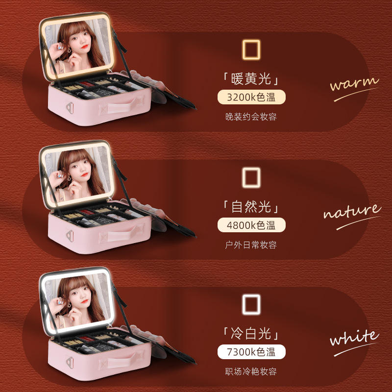 กระเป๋าเครื่องสำอางสุดหรูพร้อมไฟกระจก ความจุขนาดใหญ่ ทำจากหนัง PU พกพาสะดวก สำหรับจัดเก็บเครื่องสำอางและผลิตภัณฑ์บำรุงผิว
