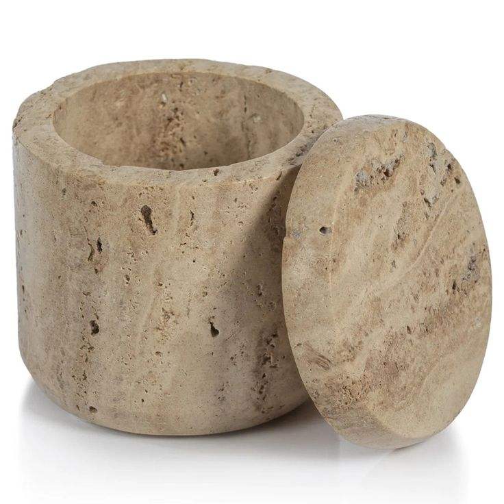 กระปุกหินอ่อน Travertine หรูหราพร้อมฝาปิด สำหรับห้องครัวและห้องน้ำ กล่องเก็บของหินสีเบจทันสมัย ดีไซน์สวยงาม