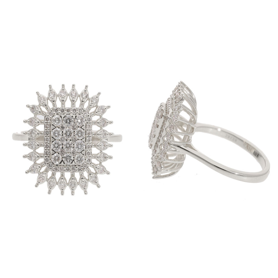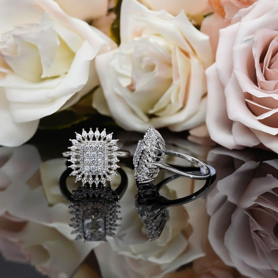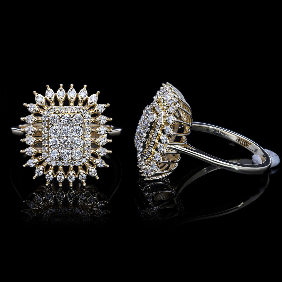 แหวนเพชรธรรมชาติสีขาว14K หรูหราพร้อมรัศมีพระอาทิตย์และการตั้งค่าหลายแถวที่สลับซับซ้อนเพื่อความสง่างามเหนือกาลเวลา