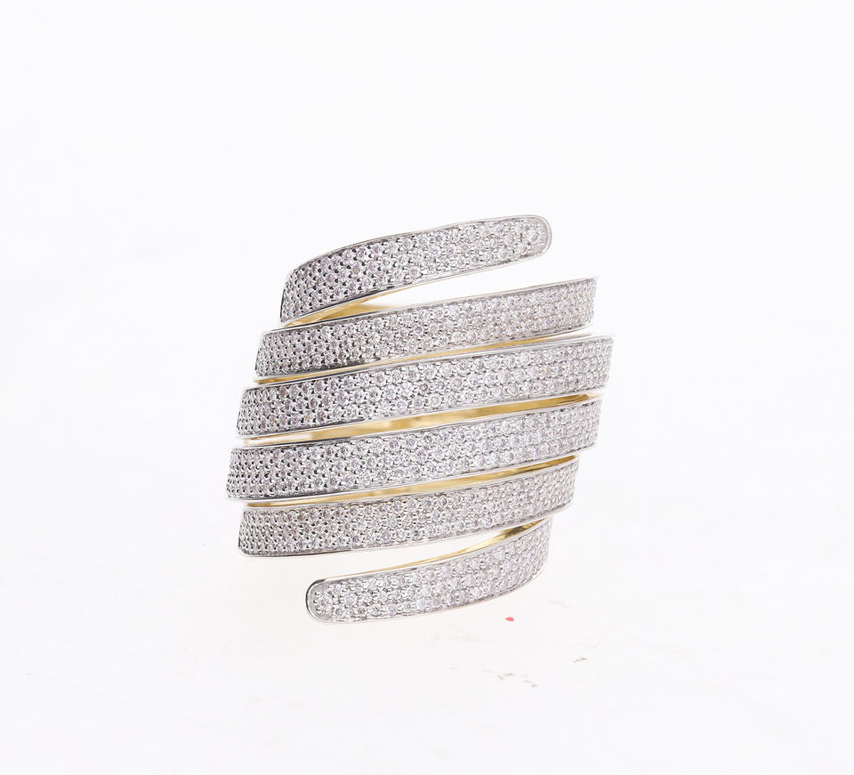 Luxurious 14K Yellow Gold Rhodium Plated Wide Spiral Ring Natural Pave Diamonds Multi-Layered Crossover Design Bold Glam Look